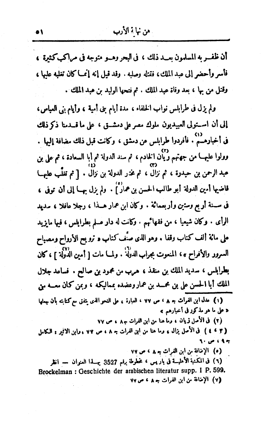 وولوا عليها من جهتهم ويان «2» الخادم، ثم سند الدولة ثم أبا السعادة، ثم على بن عبد الرحمن بن حيدرة، ثم نزال «3» ، ثم مختر الدولة بن نزال «4» . [ثم تغلّب عليها قاضيها أمين الدولة أبو طالب الحسن بن عمار «5» ] . ولم يزل بها إلى أن توفى، فى سنة أربع وستين وأربعمائة. وكان ابن عمار هذا، رجلا عافلا، سديد الرأى. وكان شيعيا، من فقهائهم. وكانت له دار علم بطرابلس، فيها ما يزيد على مائة ألف كتاب وقفا. وهو الذى صنّف كتاب «ترويح الأرواح ومصباح السرور والأفراح» ، المنعوت بجراب الدولة «6» . ولما مات [أمين الدولة «7» ] ، كان بطرابلس، سديد الملك بن منقذ، هرب من محمود بن صالح. فساعد جلال الملك أبا الحسن على بن محمد بن عمار وعضده بمماليكه، وبمن كان معه من