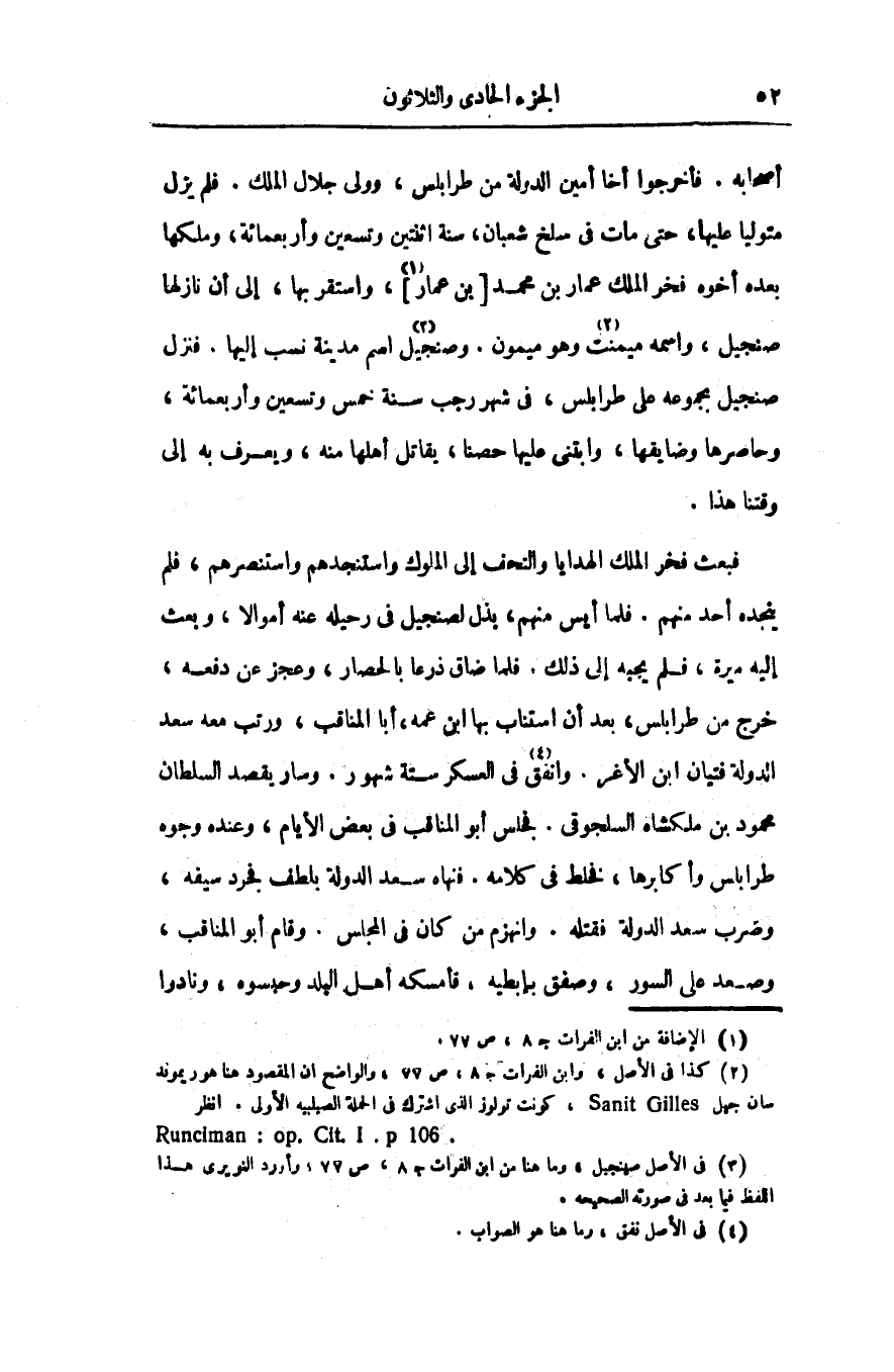 أصحابه. فأخرجوا أخا أمين الدولة من طرابلس، وولى جلال الملك. فلم يزل متوليا عليها، حتى مات فى سلخ شعبان، سنة اثنتين وتسعين وأربعمائة، وملكها بعده أخوه فخر الملك عمار بن محمد [بن عمار «1» ] ، واستقر بها، إلى أن نازلها صنجيل، واسمه ميمنت «2» وهو ميمون. وصنجيل «3» اسم مدينة نسب إليها. فنزل صنجيل بجموعه على طرابلس، فى شهر رجب سنة خمس وتسعين وأربعمائة، وحاصرها وضايقها، وابتنى عليها حصنا، يقاتل أهلها منه، ويعرف به إلى وقتنا هذا.