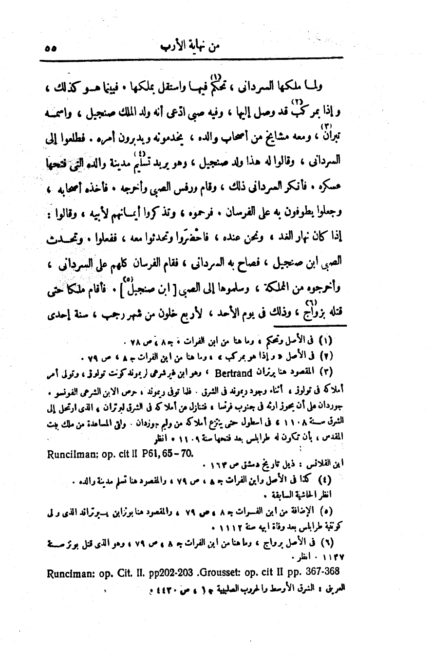 إذا كان نهار الغد، ونحن عنده، فاحضروا وتحدثوا معه، ففعلوا. وتحدث الصبى ابن صنجيل، فصاح به السردانى، فقام الفرسان كلهم على السردانى، وأخرجوه من المملكة، وسلموها إلى الصبى [ابن صنجيل «5» ] . فأقام ملكا حتى قتله بزواج «6» ، وذلك فى يوم الأحد، لأربع خلون من شهر رجب، سنة إحدى