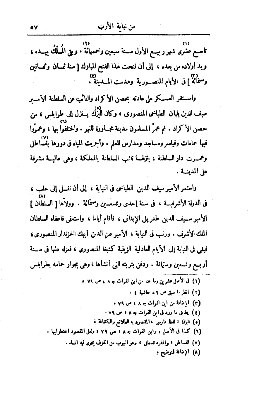 واستقر العسكر على عادته بحصن الأكراد والنائب عن السلطنة الأمير سيف الدين بلبان الطباخى المنصورى، وكان اليزك «5» ينزل إلى طرابلس، من حصن الأكراد. ثم عمرّ المسلمون مدينة مجاورة للنهر. واختلفوا «6» بها، وعمروا فيها حمامات وقياسر ومساجد ومدارس للعلم. وأجريت المياه فى دورها بقساطل «7» وعمرت دار السلطنة، ينزلها نائب السلطنة بالمملكة، وهى عالية مشرفة على المدينة.