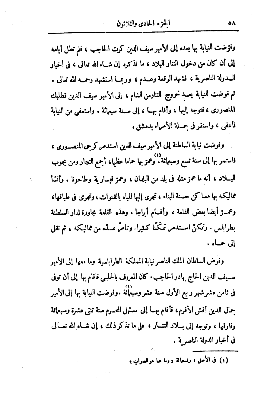وفوّضت النيابة بها بعده إلى الأمير سيف الدين كرت الحاجب، فلم تطل أيامه إلى أن كان من دخول التتار البلاد، ما نذكره إن شاء الله تعالى، فى أخبار الدولة الناصرية، فشهد الوقعة وعدم، وربما استشهد رحمه الله تعالى.