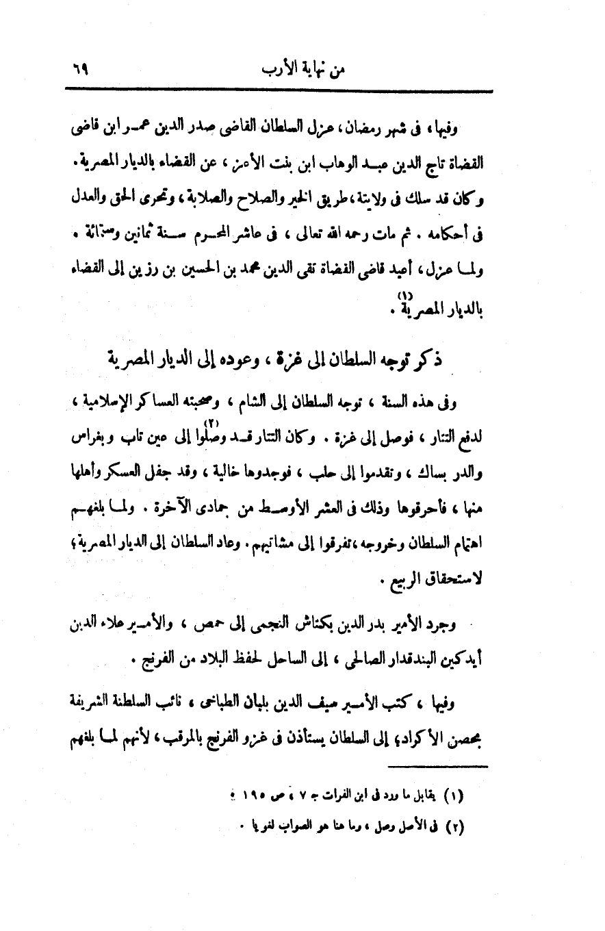 وفى هذه السنة، توجه السلطان إلى الشام، وصحبته العساكر الإسلامية، لدفع التتار، فوصل إلى غزة. وكان التتار قد وصلوا «2» إلى عين تاب وبغراس والدر بساك، وتقدموا إلى حلب، فوجدوها خالية، وقد جفل العسكر وأهلها منها، فأحرقوها وذلك فى العشر الأوسط من جمادى الآخرة. ولما بلغهم اهتمام السلطان وخروجه، تفرقوا إلى مشاتيهم. وعاد السلطان إلى الديار المصرية؛ لاستحقاق الربيع.