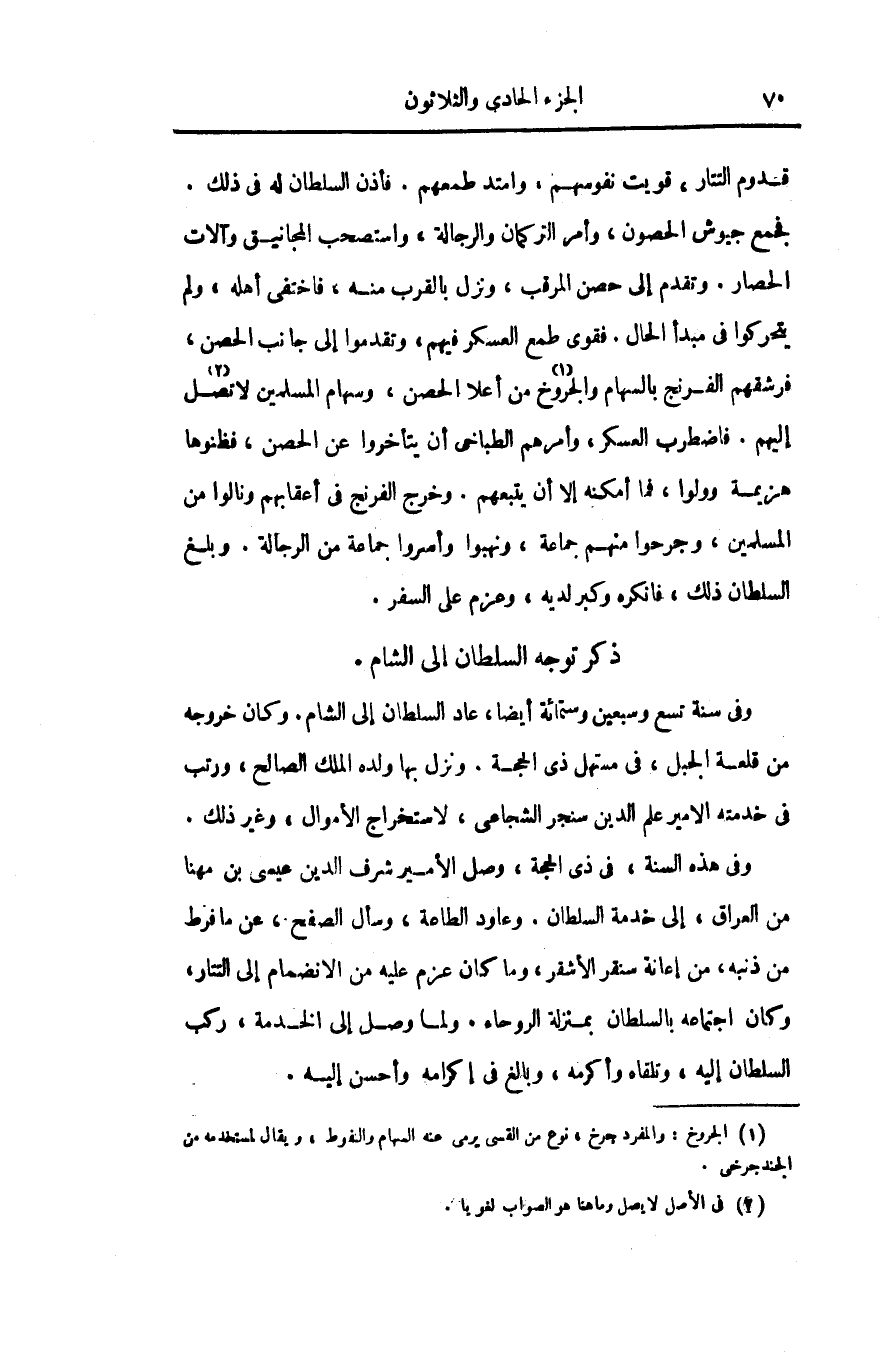 فجمع جيوش الحصون، وأمر التركمان والرجالة، واستصحب المجانيق وآلات الحصار. وتقدم إلى حصن المرقب، ونزل بالقرب منه، فاختفى أهله، ولم يتحركوا فى مبدأ الحال. فقوى طمع العسكر فيهم، وتقدموا إلى جانب الحصن، فرشقهم الفرنج بالسهام والجروخ «1» من أعلا الحصن، وسهام المسلمين لا تصل «2» إليهم. فاضطرب العسكر، وأمرهم الطباخى أن يتأخروا عن الحصن، فظنوها هزيمة وولوا، فما أمكنه إلا أن يتبعهم. وخرج الفرنج فى أعقابهم ونالوا من المسلمين، وجرحوا منهم جماعة، ونهبوا وأسروا جماعة من الرجالة. وبلغ السلطان ذلك، فانكره وكبر لديه، وعزم على السفر.
