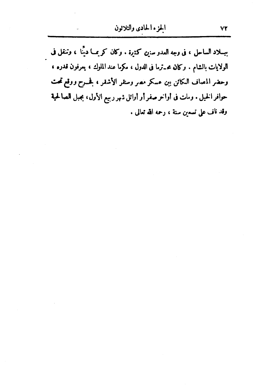 ببلاد الساحل، فى وجه العدو سنين كثيرة. وكان كريما ديّنا، وتنقل فى الولايات بالشام. وكان محترما فى الدول، مكرما عند الملوك، يعرفون قدره، وحضر المصاف الكائن بين عسكر مصر وسنقر الأشقر، فجرح ووقع تحت حوافر الخيل. ومات فى أواخر صفر أو أوائل شهر ربيع الأول، بجبل الصالحية وقد ناف على تسعين سنة، رحمه الله تعالى.