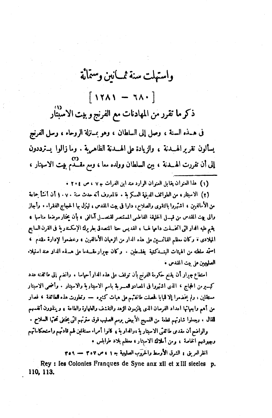 ذكر ما تقرر من المهادنات مع الفرنج وبيت الاسبتار «1»