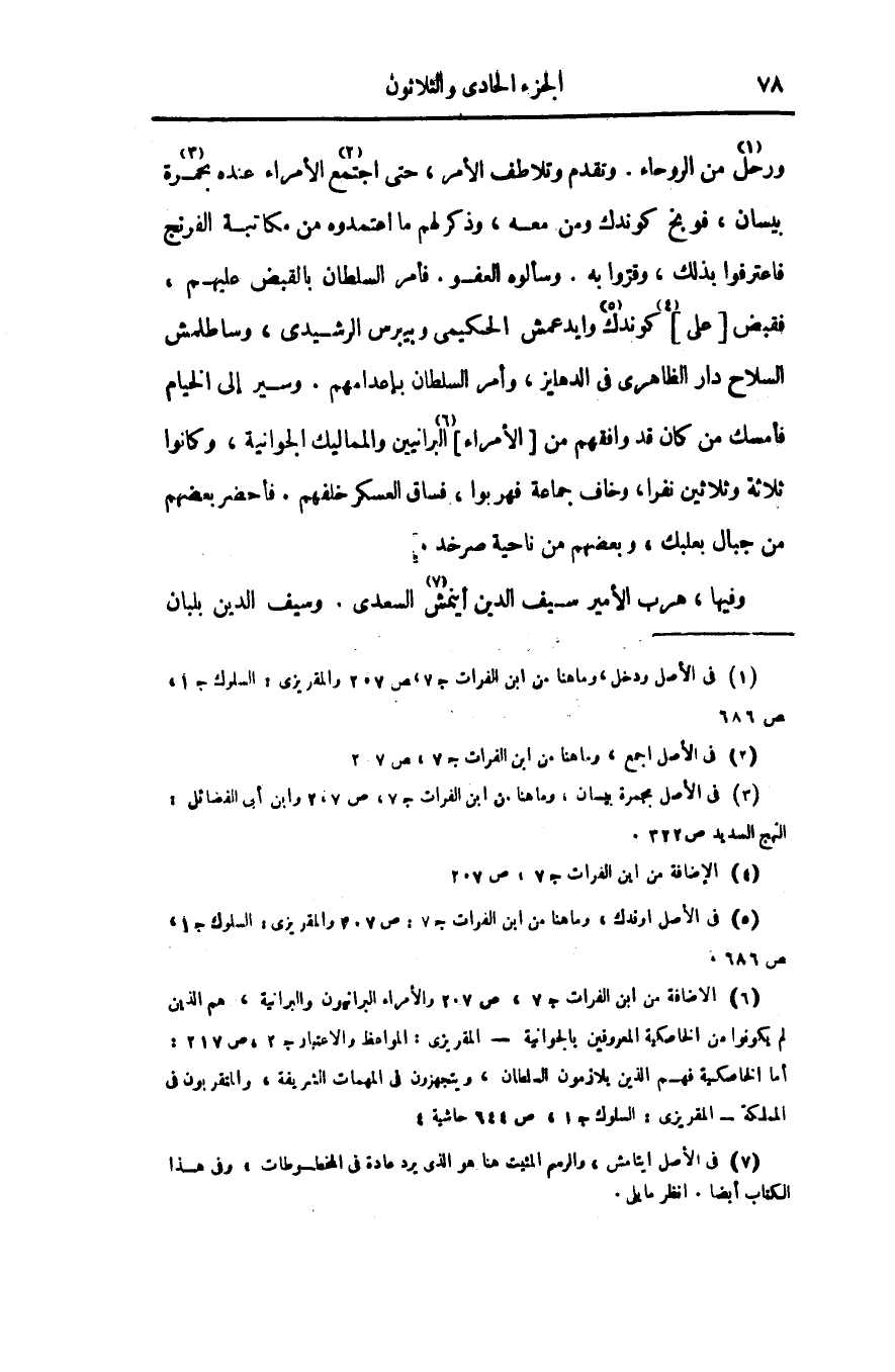 ورحل «1» من الروحاء. وتقدم وتلاطف الأمر، حتى اجتمع «2» الأمراء عنده بحمرة «3» بيسان، فوبخ كوندك ومن معه، وذكر لهم ما اعتمدوه من مكاتبة الفرنج فاعترفوا بذلك، وقرّوا به. وسألوه العفو. فأمر السلطان بالقبض عليهم، فقبض [على] «4» كوندك «5» وايدعمش الحكيمى وبيبرس الرشيدى، وساطلمش السلاح دار الظاهرى فى الدهليز، وأمر السلطان بإعدامهم. وسير إلى الخيام فأمسك من كان قد وافقهم من [الأمراء] «6» البرانيين والمماليك الجوانية، وكانوا ثلاثة وثلاثين نفرا، وخاف جماعة فهربوا، فساق العسكر خلفهم. فأحضر بعضهم من جبال بعلبك، وبعضهم من ناحية صرخد.