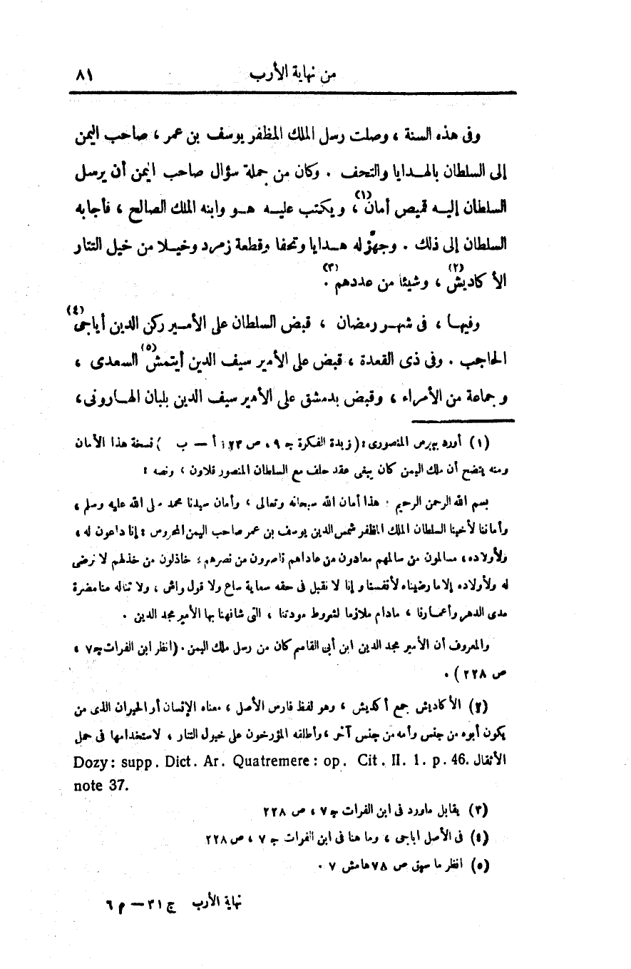 وفى هذه السنة، وصلت رسل الملك المظفر يوسف بن عمر، صاحب اليمن إلى السلطان بالهدايا والتحف. وكان من جملة سؤال صاحب اليمن أن يرسل السلطان إليه قميص أمان «1» ، ويكتب عليه هو وابنه الملك الصالح، فأجابه السلطان إلى ذلك. وجهّز له هدايا وتحفا وقطعة زمرد وخيلا من خيل التتار الأكاديش «2» ، وشيئا من عددهم «3» .