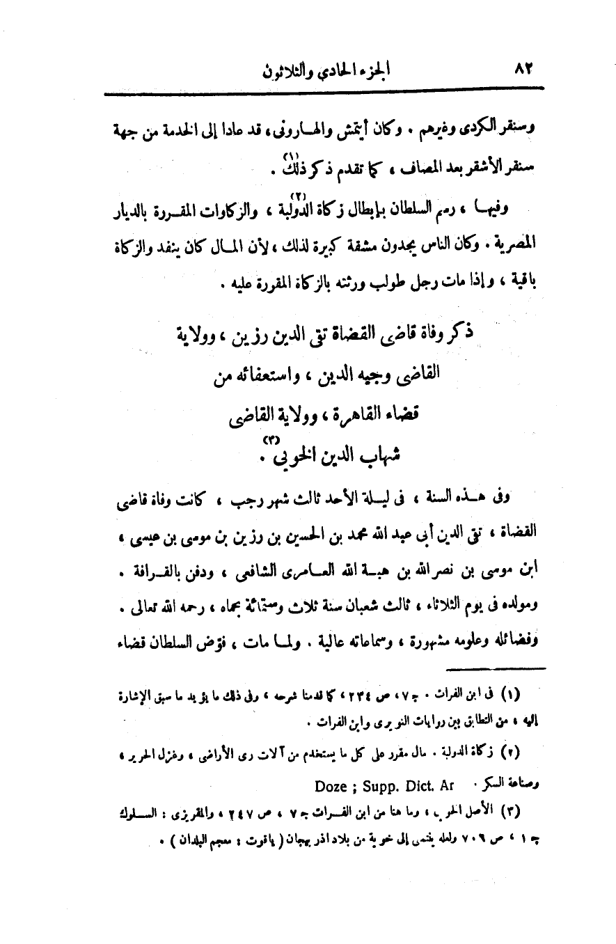 وفى هذه السنة، فى ليلة الأحد ثالث شهر رجب، كانت وفاة قاضى القضاة، تقى الدين أبى عبد الله محمد بن الحسين بن رزين بن موسى بن عيسى، ابن موسى بن نصر الله بن هبة الله العامرى الشافعى، ودفن بالقرافة.
