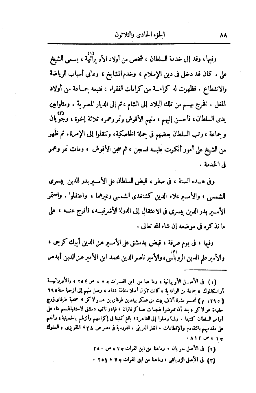 وفيها، وفد إلى خدمة السلطان، شخص من أولاد الأويراتية «1» ، يسمى الشيخ على. كان قد دخل فى دين الإسلام، وخدم المشايخ، وعانى أسباب الرياضة والانقطاع. فظهرت له كرامة من كرامات الفقراء، فتبعه جماعة من أولاد المغل. فخرج بهم من تلك البلاد إلى الشام، ثم إلى الديار المصرية. ومثلوا بين يدى السلطان، فأحسن إليهم، منهم الأقوش وتمر وعمر، ثلاثة إخوة، وجويان «2» وجماعة، رتب السلطان بعضهم فى جملة الخاصكية، وتنقلوا إلى الإمرة. ثم ظهر من الشيخ على أمور أنكرت عليه فسجن، ثم سجن الأقوش، ومات نمر وعمر فى الخدمة.