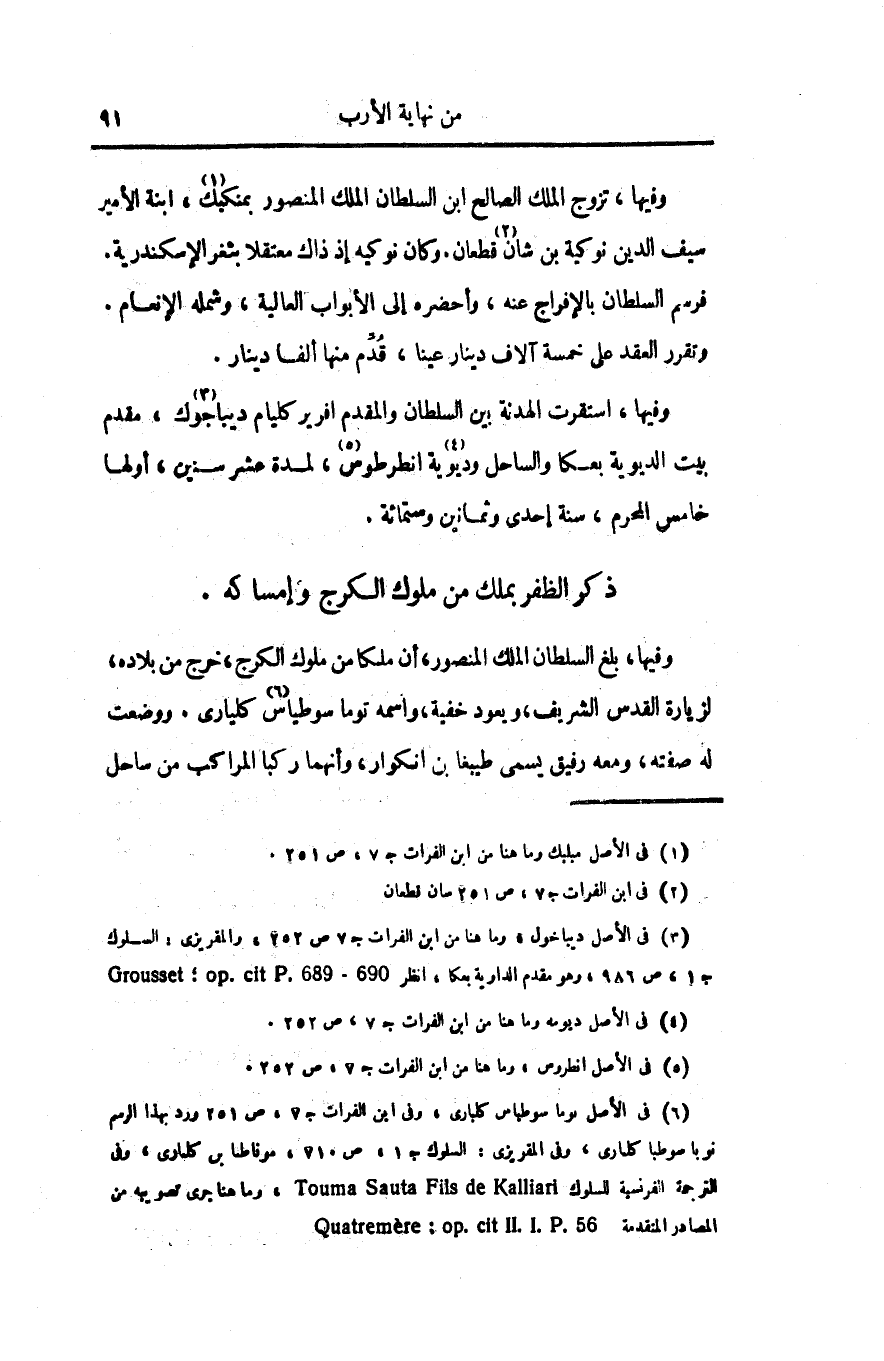 وفيها، بلغ السلطان الملك المنصور، أن ملكا من ملوك الكرج، خرج من بلاده، لزيارة القدس الشريف، ويعود خفية، واسمه توما سوطياس «6» كليارى. ووضعت له صفته، ومعه رفيق يسمى طيبغا بن انكوار، وأنهما ركبا المراكب من ساحل