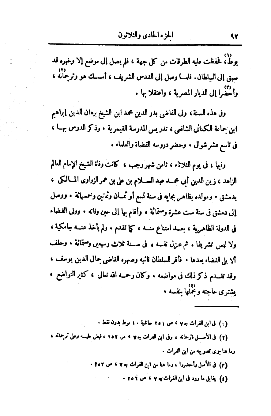 وفيها، فى يوم الثلاثاء، ثامن شهر رجب، كانت وفاة الشيخ الإمام العالم الزاهد، زين الدين أبى محمد عبد السلام بن على بن عمر الزاووى المالكى، بدمشق. ومولده بظاهر بجايه فى سنة تسع أو ثمان وثمانين وخمسمائة. ووصل إلى دمشق فى سنة ست عشرة وستمائة، وأقام بها إلى حين وفاته. وولى القضاء فى الدولة الظاهرية، بعد امتناع منه، كما تقدم. ولم يأخذ عنه جامكية، ولا لبس تشريفا. ثم عزل نفسه، فى سنة ثلاث وسبعين وستمائة. وحلف ألا بلى القضاء بعدها. فأقر السلطان نائبه وصهره القاضى جمال الدين يوسف، وقد تقدم ذكر ذلك فى مواضعه. وكان رحمه الله تعالى، كثير التواضع، يشترى حاجته وبحملها «4» بنفسه.