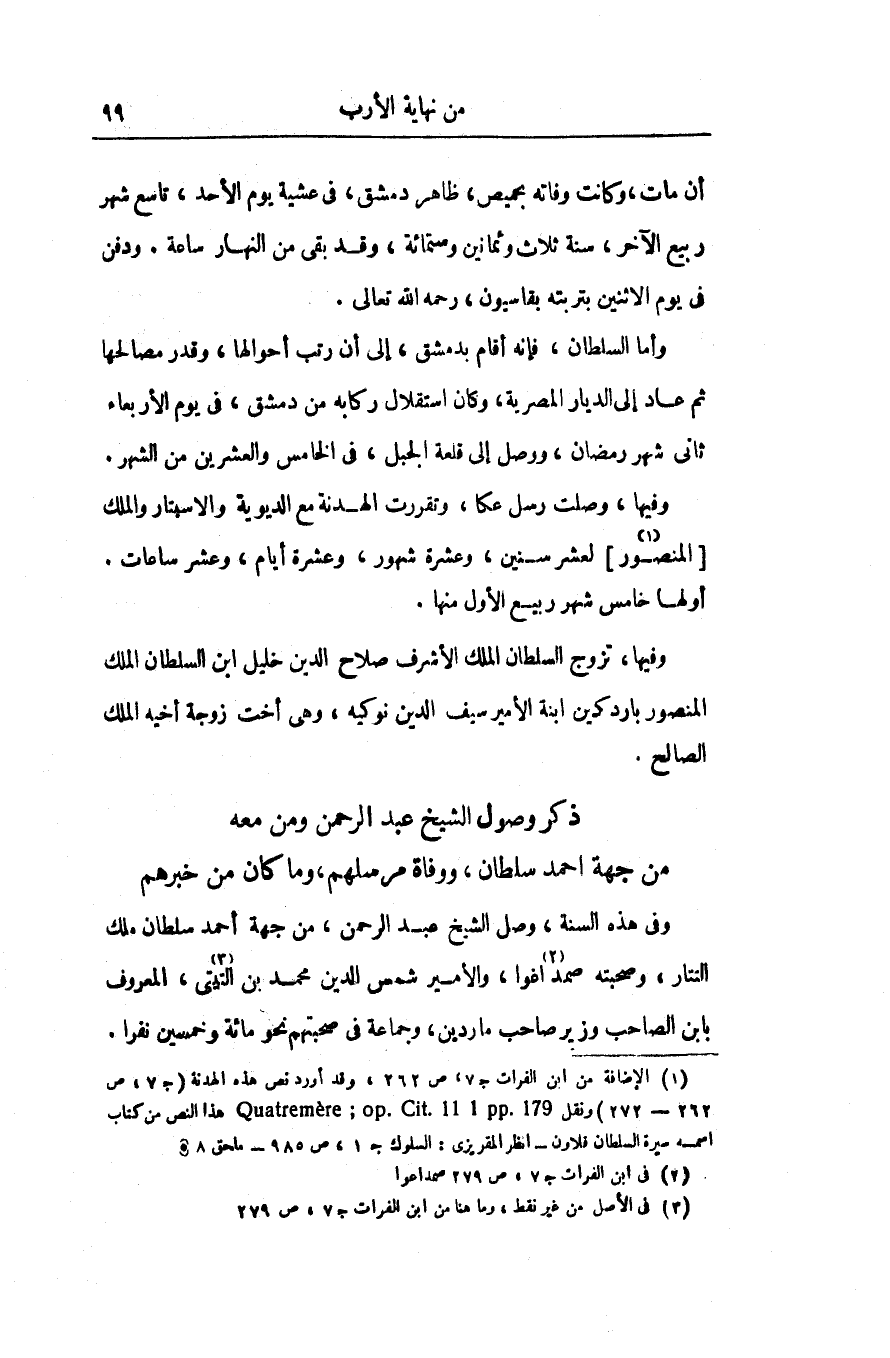 وأما السلطان، فإنه أقام بدمشق، إلى أن رتب أحوالها، وقدر مصالحها ثم عاد إلى الديار المصرية، وكان استقلال ركابه من دمشق، فى يوم الأربعاء ثانى شهر رمضان، ووصل إلى قلعة الجبل، فى الخامس والعشرين من الشهر.