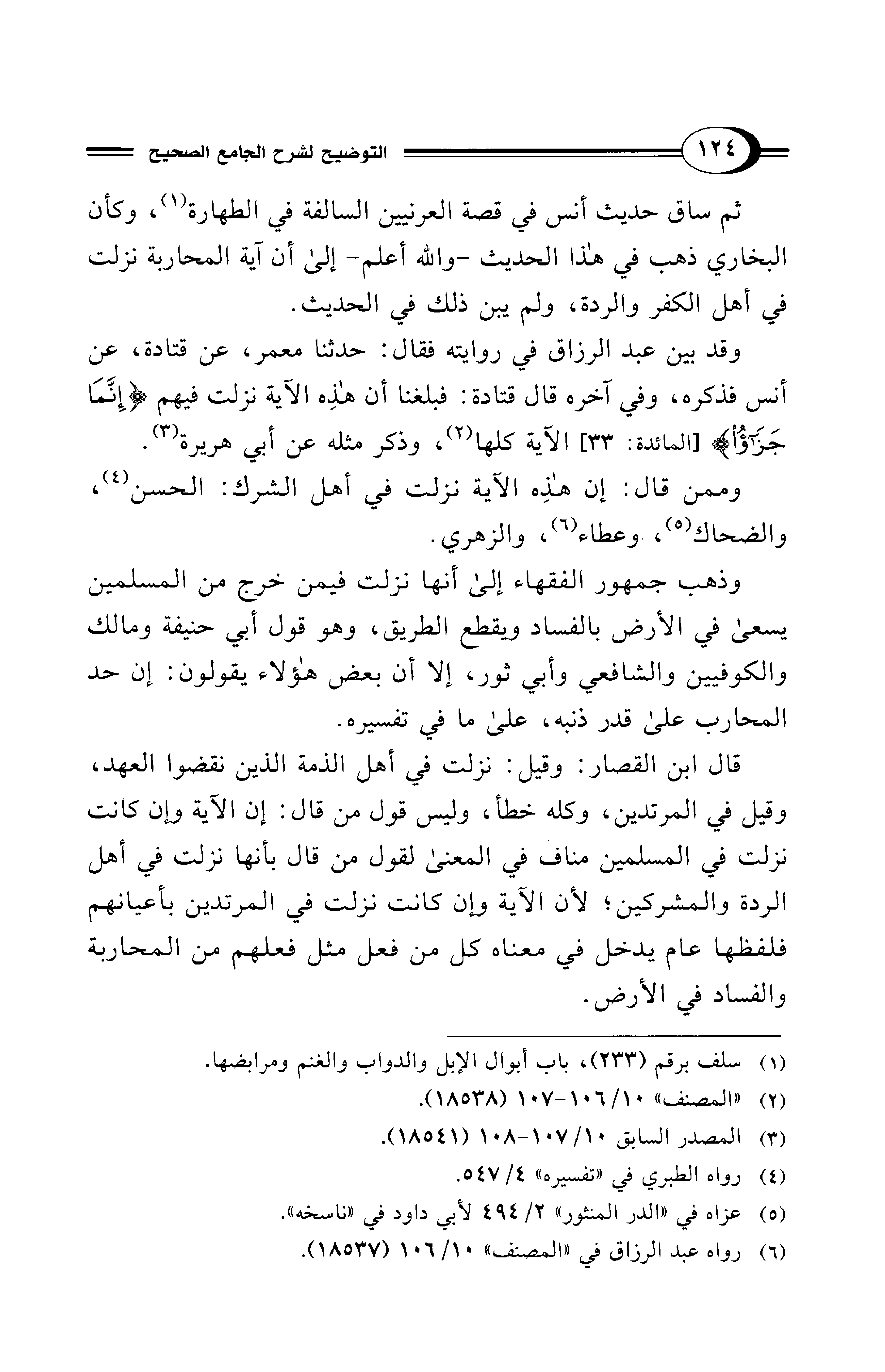 وذهب جمهور الفقهاء إلى أنها نزلت فيمن خرج من المسلمين يسعى في الأرض بالفساد ويقطع الطريق، وهو قول أبي حنيفة ومالك والكوفيين والشافعي وأبي ثور، إلا أن بعض هؤلاء يقولون: إن حد المحارب على قدر ذنبه، على ما في تفسيره.