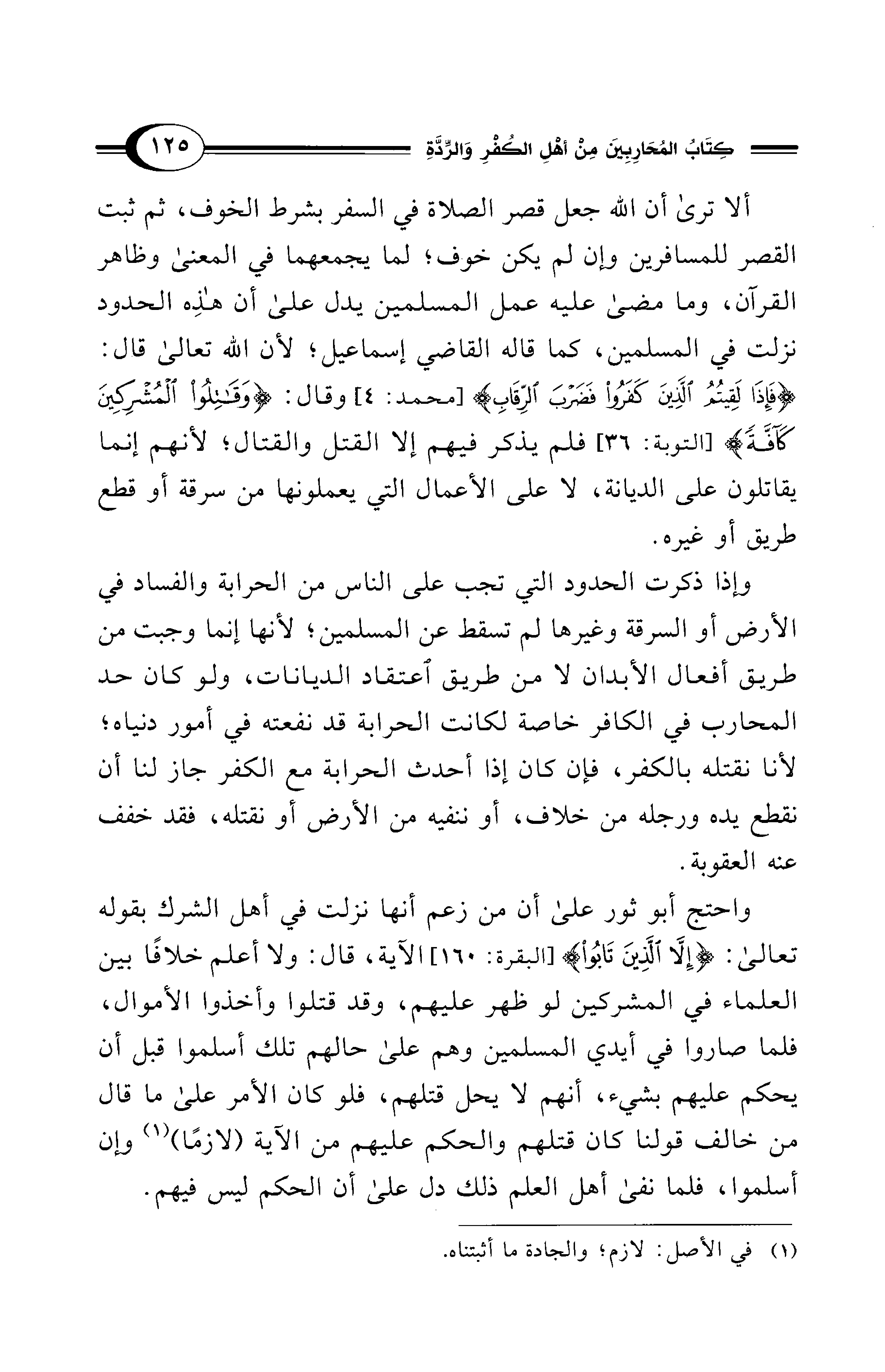 ألا ترى أن الله جعل قصر الصلاة في السفر بشرط الخوف، ثم ثبت القصر للمسافرين وإن لم يكن خوف؛ لما يجمعهما في المعنى وظاهر القرآن، وما مضى عليه عمل المسلمين يدل على أن هذِه الحدود نزلت في المسلمين، كما قاله القاضي إسماعيل؛ لأن الله تعالى قال: {فَإِذَا لَقِيتُمُ الَّذِينَ كَفَرُوا فَضَرْبَ الرِّقَابِ} [محمد: 4] وقال: {وَقَاتِلُوا الْمُشْرِكِينَ كَافَّةً} [التوبة: 36] فلم يذكر فيهم إلا القتل والقتال؛ لأنهم إنما يقاتلون على الديانة، لا على الأعمال التي يعملونها من سرقة أو قطع طريق أو غيره.