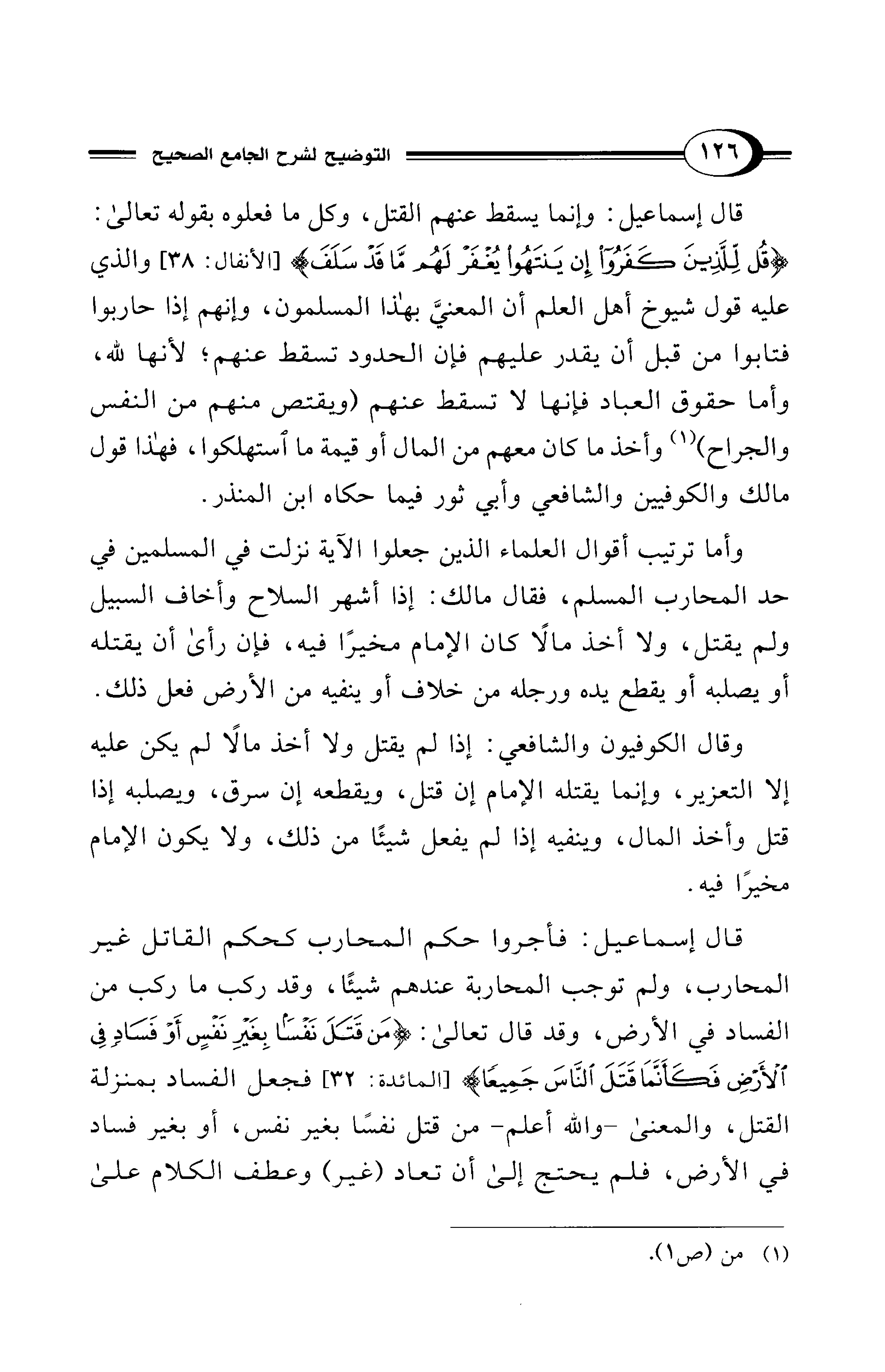 قال إسماعيل: فأجروا حكم المحارب كحكم القاتل غير المحارب، ولم توجب المحاربة عندهم شيئًا، وقد ركب ما ركب من الفساد في الأرض، وقد قال تعالى: {مَنْ قَتَلَ نَفْسًا بِغَيْرِ نَفْسٍ أَوْ فَسَادٍ فِي الْأَرْضِ فَكَأَنَّمَا قَتَلَ النَّاسَ جَمِيعًا} [المائدة: 32] فجعل الفساد بمنزلة القتل، والمعنى -والله أعلم- من قتل نفسًا بغير نفس، أو بغير فساد في الأرض، فلم يحتج إلى أن تعاد (غير) وعطف الكلام على