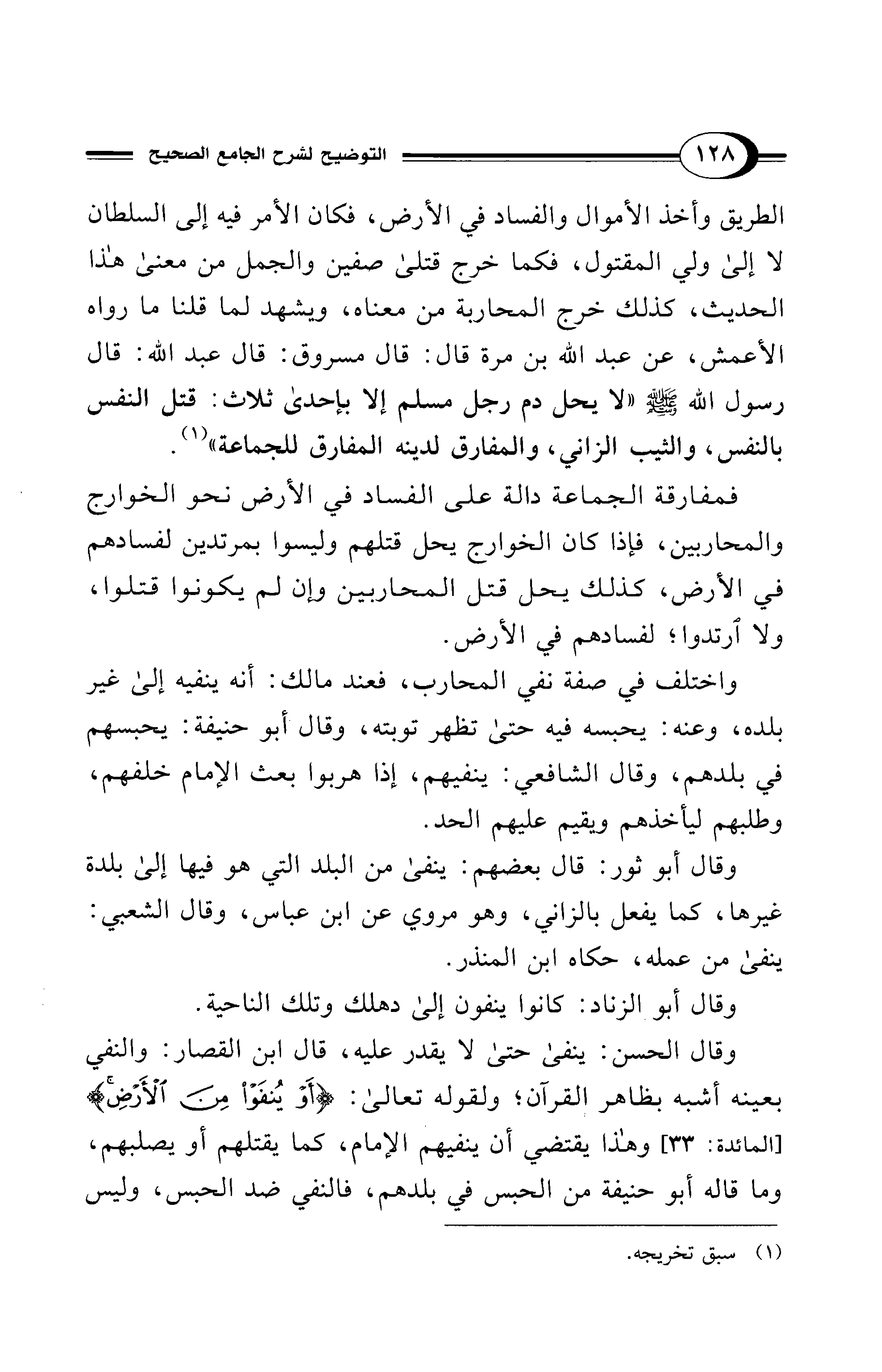 فمفارقة الجماعة دالة على الفساد في الأرض نحو الخوارج والمحاربين، فإذا كان الخوارج يحل قتلهم وليسوا بمرتدين لفسادهم في الأرض، كذلك يحل قتل المحاربين وإن لم يكونوا قتلوا، ولا ارتدوا؛ لفسادهم في الأرض.
