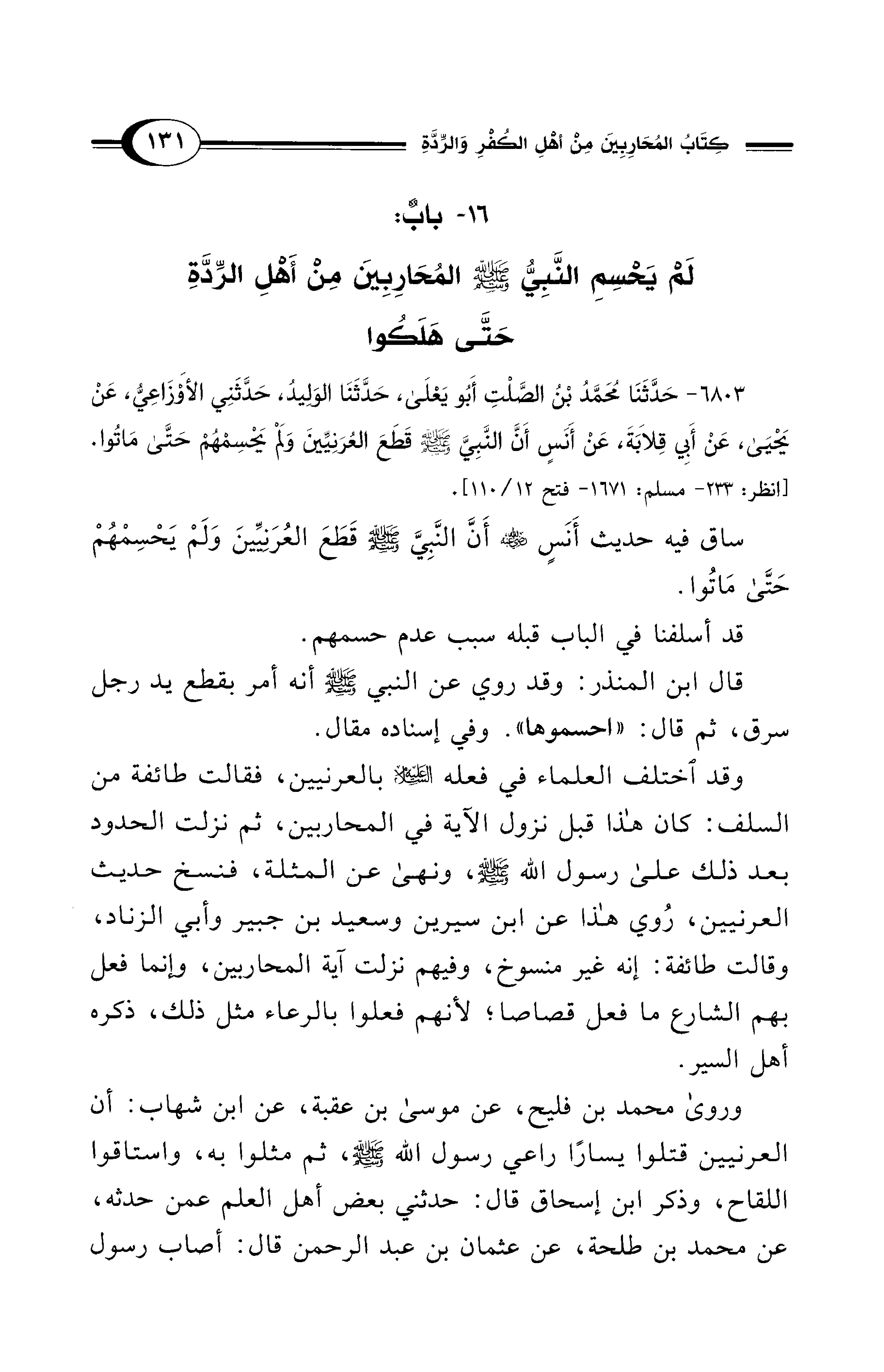 6803 - حَدَّثَنَا مُحَمَّدُ بْنُ الصَّلْتِ أَبُو يَعْلَى، حَدَّثَنَا الْوَلِيدُ، حَدَّثَنِي الأَوْزَاعِيُّ، عَنْ يَحْيَى، عَنْ أَبِي قِلاَبَةَ، عَنْ أَنَسٍ أَنَّ النَّبِيَّ - صلى الله عليه وسلم - قَطَعَ الْعُرَنِيِّينَ وَلَمْ يَحْسِمْهُمْ حَتَّى مَاتُوا. [انظر: 233 - مسلم: 1671 - فتح 12/ 110].