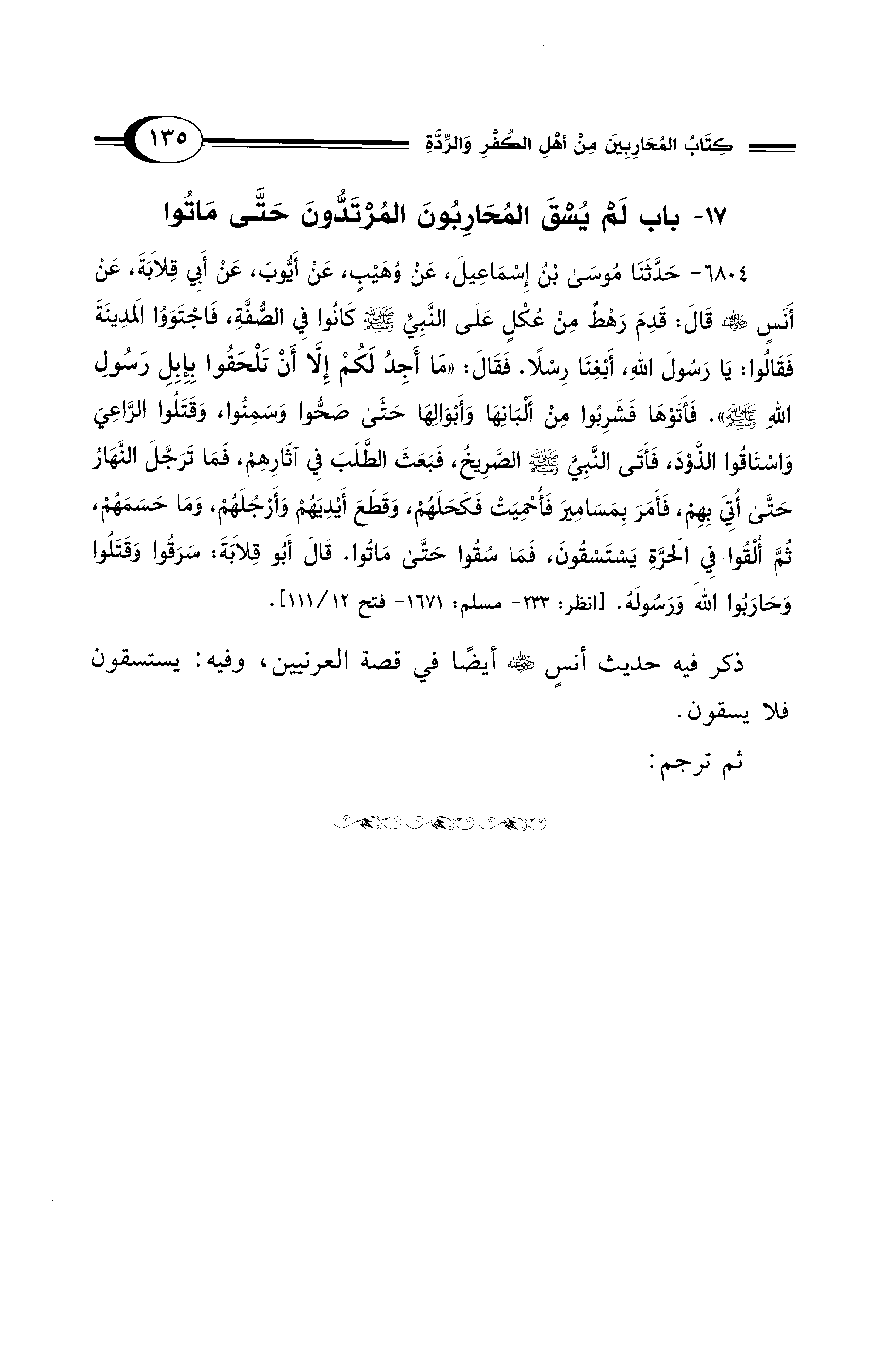 6804 - حَدَّثَنَا مُوسَى بْنُ إِسْمَاعِيلَ، عَنْ وُهَيْبٍ، عَنْ أَيُّوبَ، عَنْ أَبِي قِلاَبَةَ، عَنْ أَنَسٍ - رضي الله عنه - قَالَ: قَدِمَ رَهْطٌ مِنْ عُكْلٍ عَلَى النَّبِيِّ - صلى الله عليه وسلم - كَانُوا فِي الصُّفَّةِ، فَاجْتَوَوُا المَدِينَةَ فَقَالُوا: يَا رَسُولَ اللهِ، أَبْغِنَا رِسْلاً. فَقَالَ: «مَا أَجِدُ لَكُمْ إِلاَّ أَنْ تَلْحَقُوا بِإِبِلِ رَسُولِ اللهِ - صلى الله عليه وسلم -». فَأَتَوْهَا فَشَرِبُوا مِنْ أَلْبَانِهَا وَأَبْوَالِهَا حَتَّى صَحُّوا وَسَمِنُوا، وَقَتَلُوا الرَّاعِيَ وَاسْتَاقُوا الذَّوْدَ، فَأَتَى النَّبِيَّ - صلى الله عليه وسلم - الصَّرِيخُ، فَبَعَثَ الطَّلَبَ فِي آثَارِهِمْ، فَمَا تَرَجَّلَ النَّهَارُ حَتَّى أُتِيَ بِهِمْ، فَأَمَرَ بِمَسَامِيرَ فَأُحْمِيَتْ فَكَحَلَهُمْ وَقَطَعَ أَيْدِيَهُمْ وَأَرْجُلَهُمْ، وَمَا حَسَمَهُمْ، ثُمَّ أُلْقُوا فِي الْحَرَّةِ يَسْتَسْقُونَ، فَمَا سُقُوا حَتَّى مَاتُوا. قَالَ أَبُو قِلاَبَةَ: سَرَقُوا وَقَتَلُوا وَحَارَبُوا اللهَ وَرَسُولَهُ. [انظر: 233 - مسلم: 1671 - فتح 12/ 111].