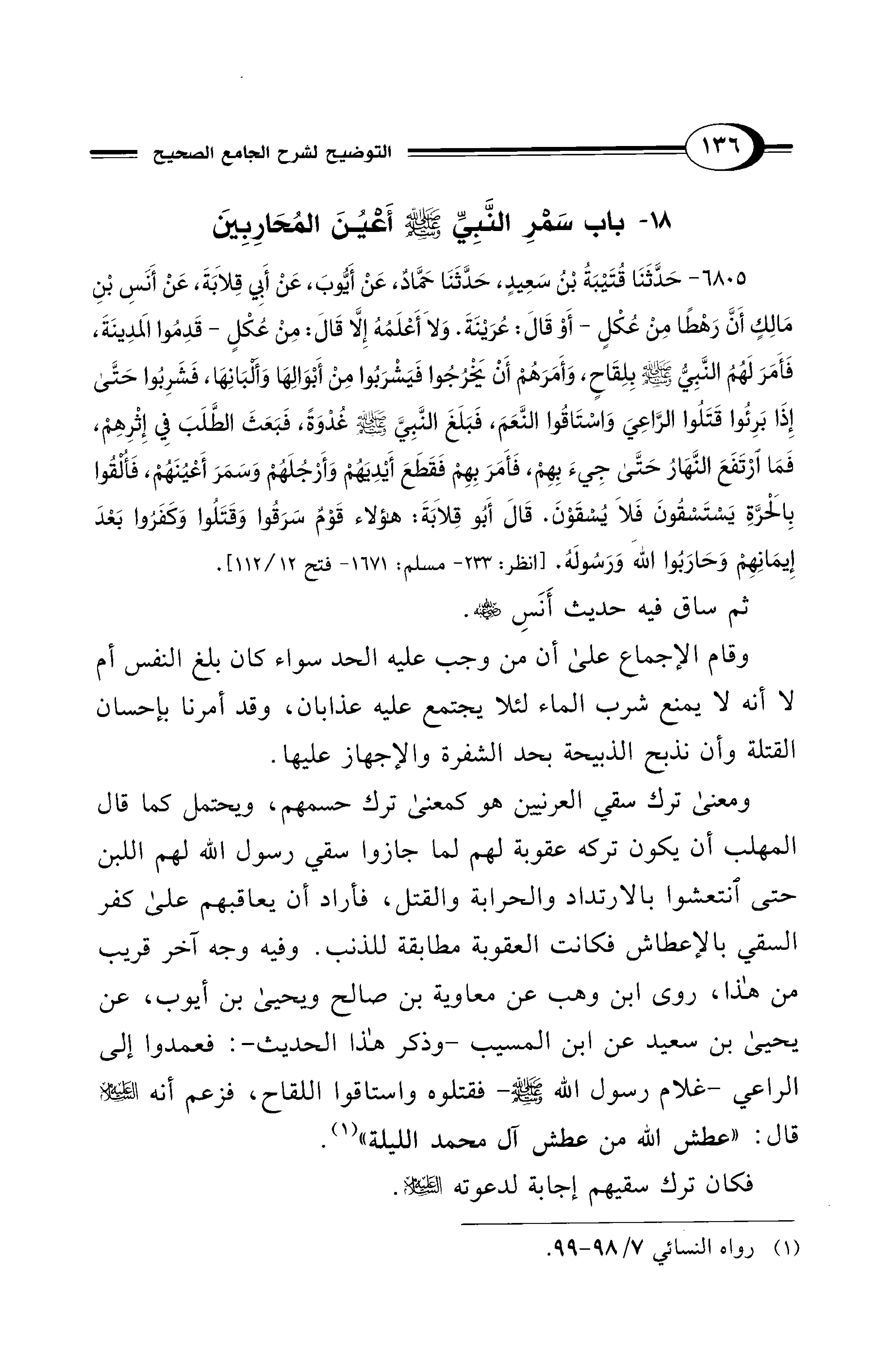 6805 - حَدَّثَنَا قُتَيْبَةُ بْنُ سَعِيدٍ، حَدَّثَنَا حَمَّادٌ، عَنْ أَيُّوبَ، عَنْ أَبِي قِلاَبَةَ، عَنْ أَنَسِ بْنِ مَالِكٍ أَنَّ رَهْطًا مِنْ عُكْلٍ -أَوْ قَالَ: عُرَيْنَةَ. وَلاَ أَعْلَمُهُ إِلاَّ قَالَ: مِنْ عُكْلٍ- قَدِمُوا المَدِينَةَ، فَأَمَرَ لَهُمُ النَّبِيُّ - صلى الله عليه وسلم - بِلِقَاحٍ، وَأَمَرَهُمْ أَنْ يَخْرُجُوا فَيَشْرَبُوا مِنْ أَبْوَالِهَا وَأَلْبَانِهَا، فَشَرِبُوا حَتَّى إِذَا بَرِئُوا قَتَلُوا الرَّاعِيَ وَاسْتَاقُوا النَّعَمَ، فَبَلَغَ النَّبِيَّ - صلى الله عليه وسلم - غُدْوَةً، فَبَعَثَ الطَّلَبَ فِي إِثْرِهِمْ، فَمَا ارْتَفَعَ النَّهَارُ حَتَّى جِيءَ بِهِمْ، فَأَمَرَ بِهِمْ فَقَطَعَ أَيْدِيَهُمْ وَأَرْجُلَهُمْ وَسَمَرَ أَعْيُنَهُمْ، فَأُلْقُوا بِالْحَرَّةِ يَسْتَسْقُونَ فَلاَ يُسْقَوْنَ. قَالَ أَبُو قِلاَبَةَ: هَؤُلاَءِ قَوْمٌ سَرَقُوا، وَقَتَلُوا، وَكَفَرُوا بَعْدَ إِيمَانِهِمْ وَحَارَبُوا اللهَ وَرَسُولَهُ. [انظر: 233 - مسلم: 1671 - فتح 12/ 112].