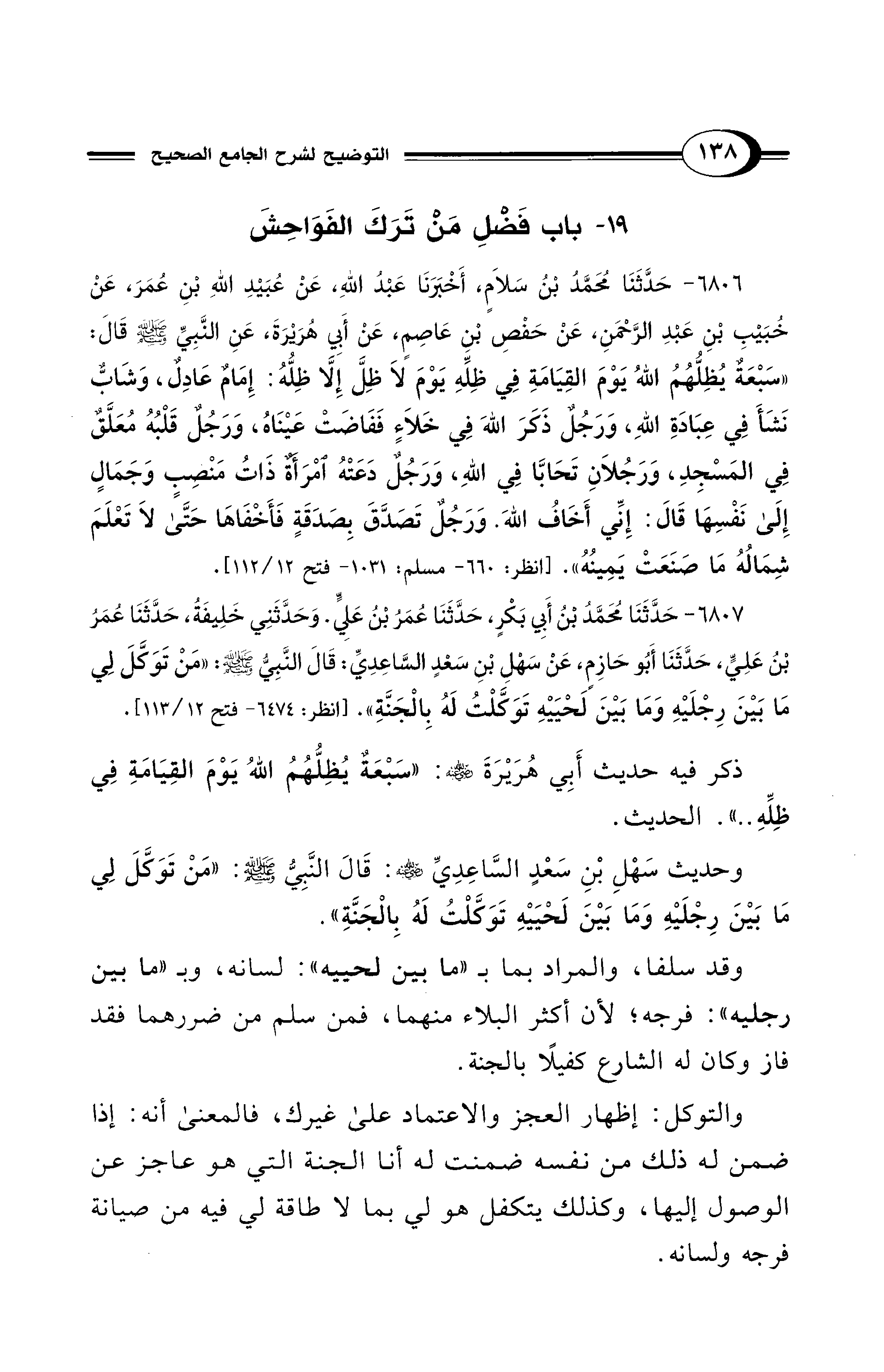 ذكر فيه حديث أَبِي هُرَيْرَةَ - رضي الله عنه -: "سَبْعَةٌ يُظِلُّهُمُ اللهُ يَوْمَ القِيَامَةِ فِي ظِلِّهِ .. ". الحديث.
