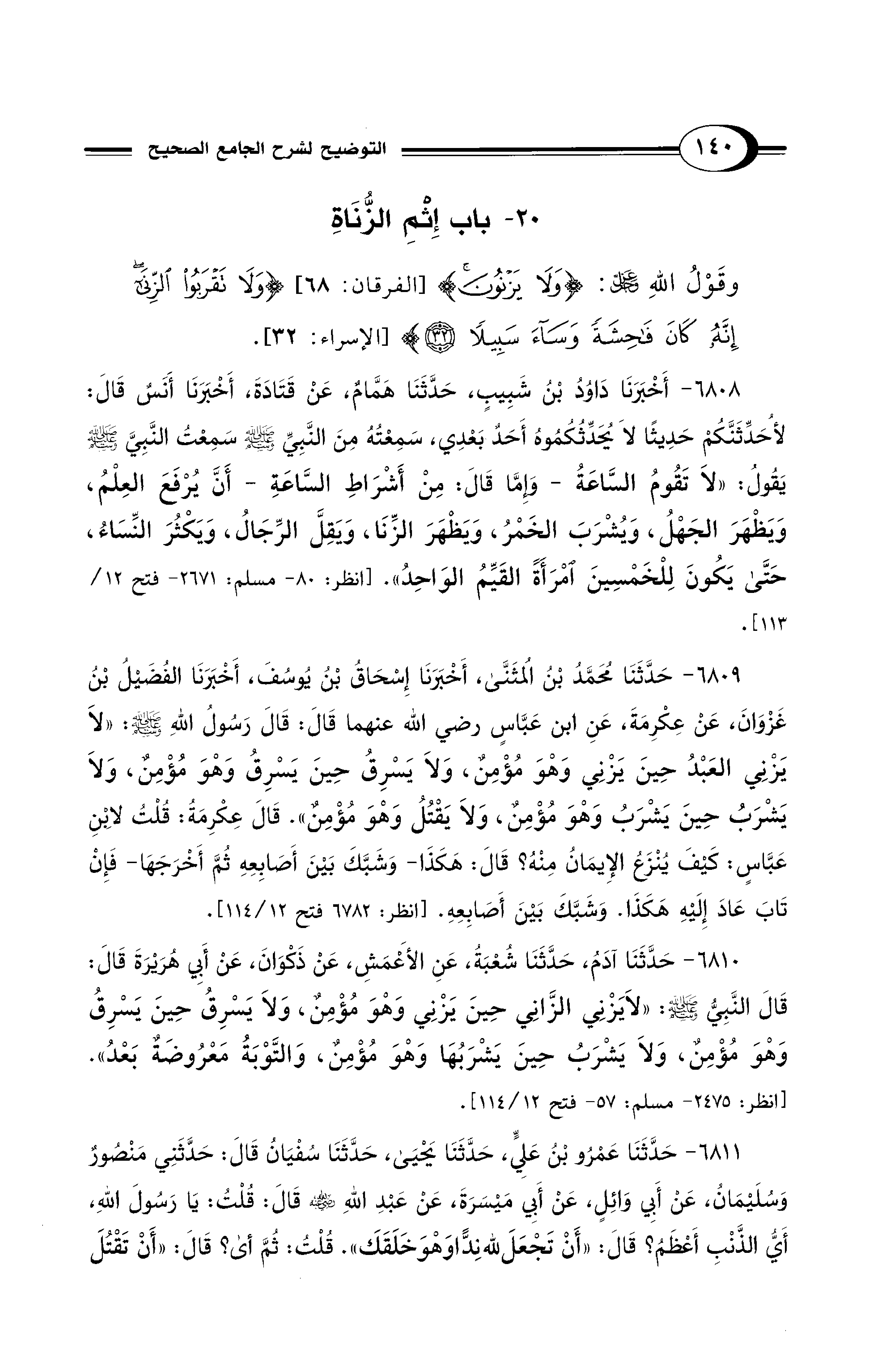 وقَوْلُ اللهِ -عَزَّ وَجَلَّ-: {وَلاَ يَزْنُونَ} [الفرقان:68] {وَلاَ تَقْرَبُوا الزِّنَا إِنَّهُ كَانَ فَاحِشَةً وَسَاءَ سَبِيلاً (32)} [الإسراء: 32].