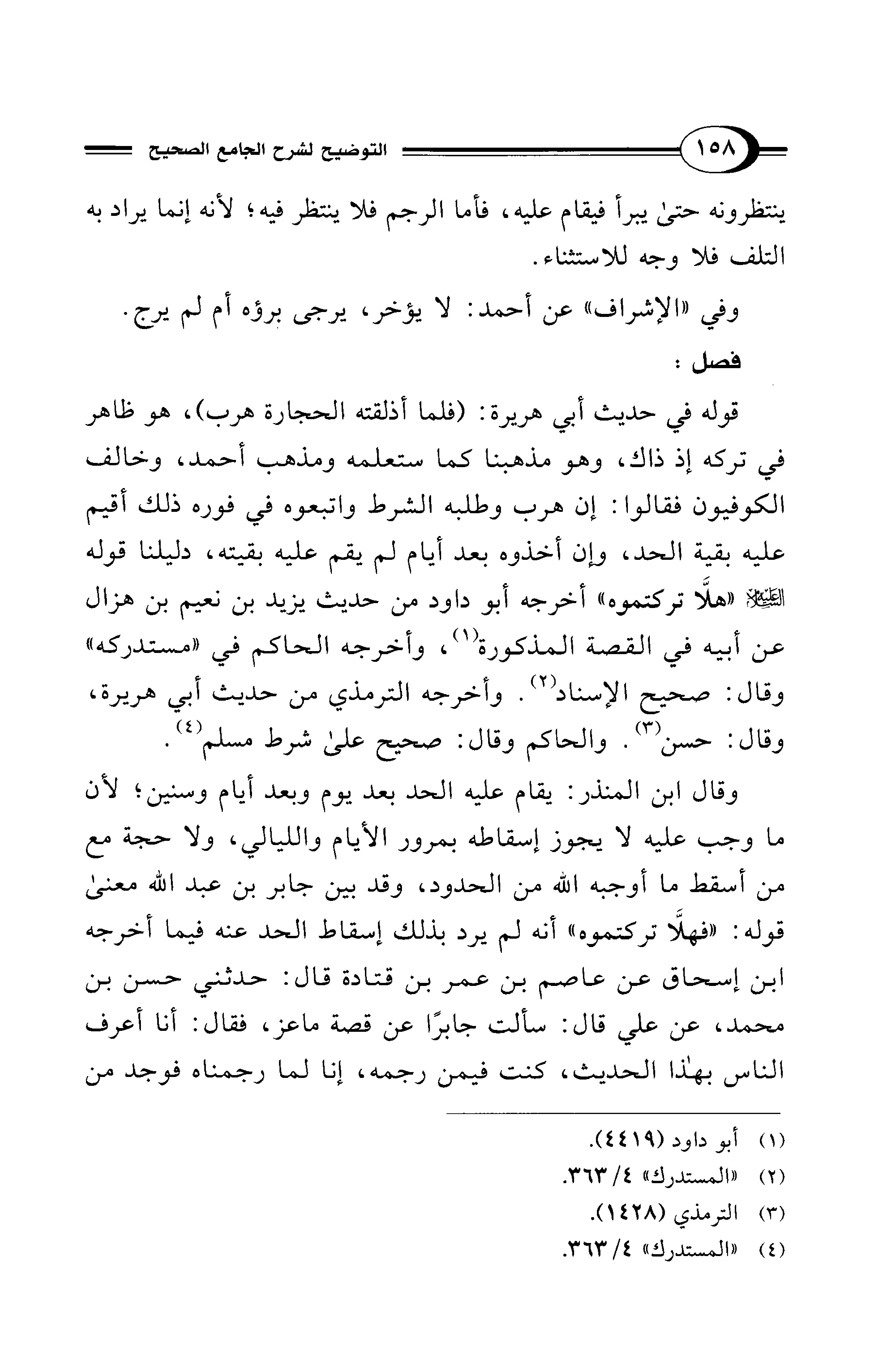 وقال ابن المنذر: يقام عليه الحد بعد يوم وبعد أيام وسنين؛ لأن ما وجب عليه لا يجوز إسقاطه بمرور الأيام والليالي، ولا حجة مع من أسقط ما أوجبه الله من الحدود، وقد بين جابر بن عبد الله معنى قوله: "فهلَّا تركتموه" أنه لم يرد بذلك إسقاط الحد عنه فيما أخرجه ابن إسحاق عن عاصم بن عمر بن قتادة قال: حدثني حسن بن محمد، عن علي قال: سألت جابرًا عن قصة ماعز، فقال: أنا أعرف الناس بهذا الحديث، كنت فيمن رجمه، إنا لما رجمناه فوجد من