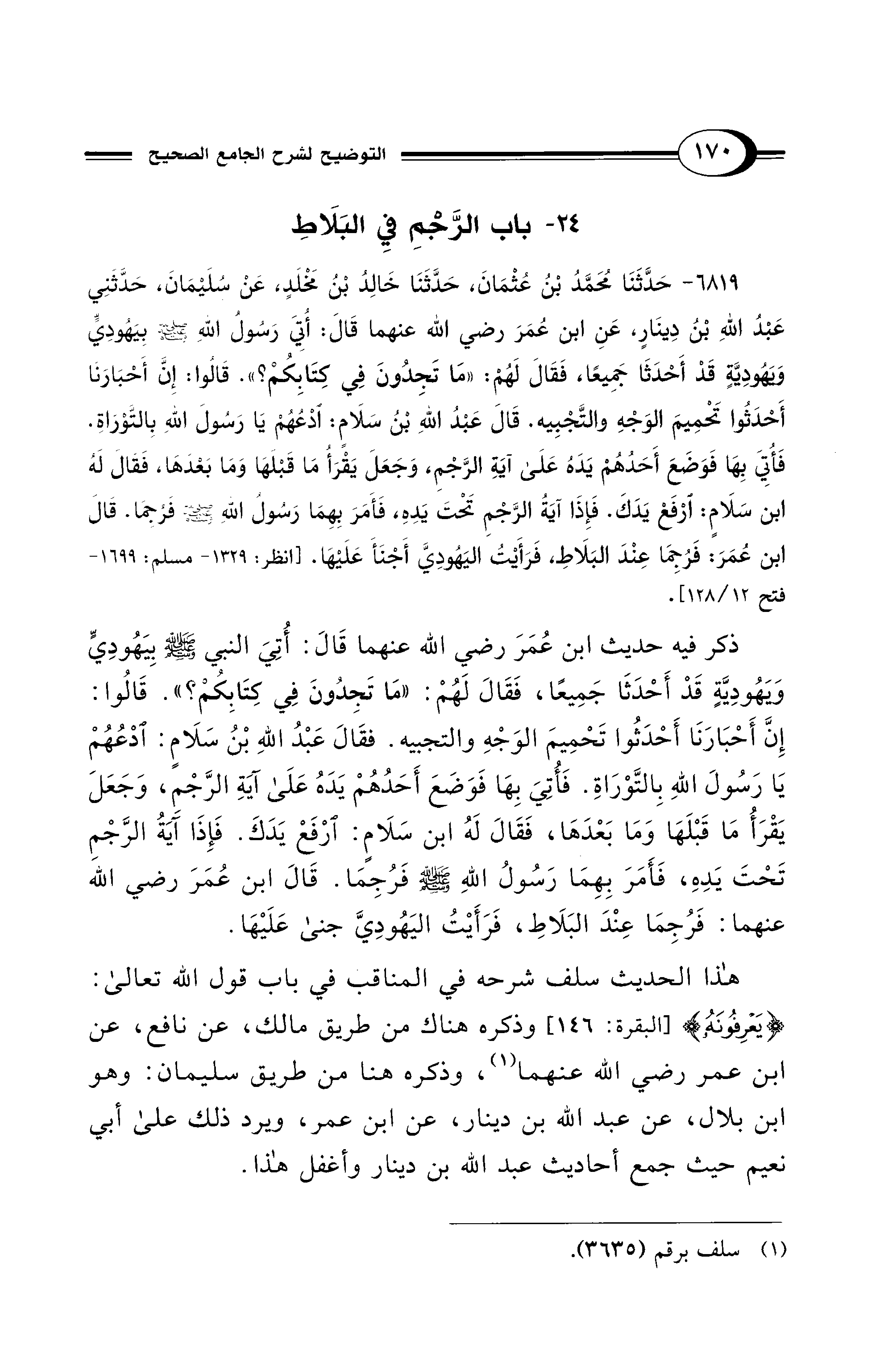 6819 - حَدَّثَنَا مُحَمَّدُ بْنُ عُثْمَانَ، حَدَّثَنَا خَالِدُ بْنُ مَخْلَدٍ، عَنْ سُلَيْمَانَ، حَدَّثَنِي عَبْدُ اللهِ بْنُ دِينَارٍ، عَنِ ابْنِ عُمَرَ - رضي الله عنهما - قَالَ: أُتِيَ رَسُولُ اللهِ - صلى الله عليه وسلم - بِيَهُودِيٍّ وَيَهُودِيَّةٍ قَدْ أَحْدَثَا جَمِيعًا، فَقَالَ لَهُمْ: «مَا تَجِدُونَ في كِتَابِكُمْ؟». قَالُوا: إِنَّ أَحْبَارَنَا أَحْدَثُوا تَحْمِيمَ الْوَجْهِ وَالتَّجْبِيَةَ. قَالَ عَبْدُ اللهِ بْنُ سَلاَمٍ: ادْعُهُمْ يَا رَسُولَ اللهِ بِالتَّوْرَاةِ. فَأُتِيَ بِهَا فَوَضَعَ أَحَدُهُمْ يَدَهُ عَلَى آيَةِ الرَّجْمِ، وَجَعَلَ يَقْرَأُ مَا قَبْلَهَا وَمَا بَعْدَهَا، فَقَالَ لَهُ ابْنُ سَلاَمٍ: ارْفَعْ يَدَكَ. فَإِذَا آيَةُ الرَّجْمِ، تَحْتَ يَدِهِ، فَأَمَرَ بِهِمَا رَسُولُ اللهِ - صلى الله عليه وسلم - فَرُجِمَا. قَالَ ابْنُ عُمَرَ: فَرُجِمَا عِنْدَ الْبَلاَطِ، فَرَأَيْتُ الْيَهُودِيَّ أَجْنَأَ عَلَيْهَا. [انظر: 1329 - مسلم: 1699 - فتح 12/ 128].