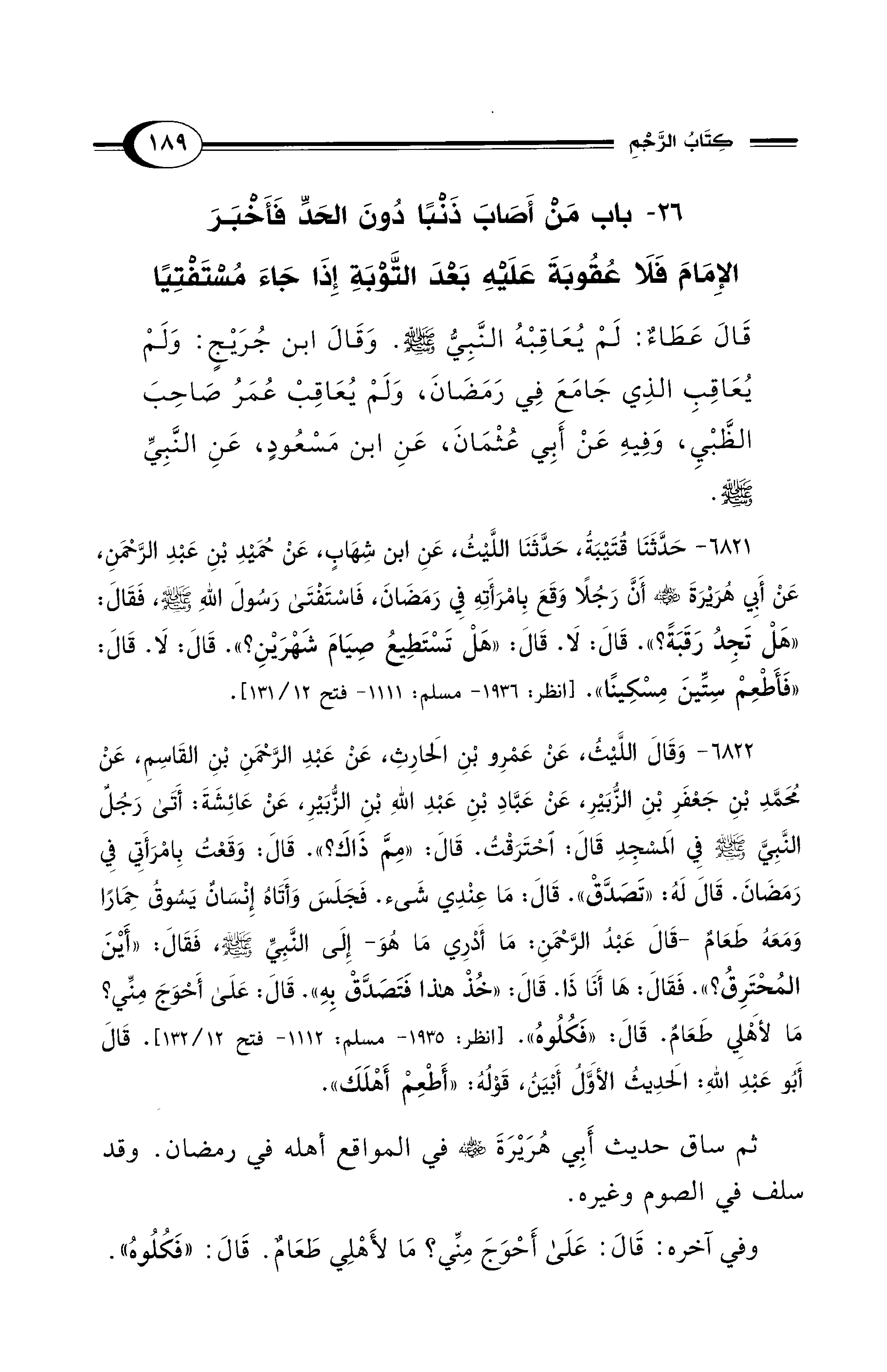 6821 - حَدَّثَنَا قُتَيْبَةُ، حَدَّثَنَا اللَّيْثُ، عَنِ ابْنِ شِهَابٍ، عَنْ حُمَيْدِ بْنِ عَبْدِ الرَّحْمَنِ، عَنْ أَبِي هُرَيْرَةَ - رضي الله عنه - أَنَّ رَجُلاً وَقَعَ بِامْرَأَتِهِ فِي رَمَضَانَ، فَاسْتَفْتَى رَسُولَ اللهِ - صلى الله عليه وسلم -, فَقَالَ: «هَلْ تَجِدُ رَقَبَةً؟». قَالَ: لاَ. قَالَ: «هَلْ تَسْتَطِيعُ صِيَامَ شَهْرَيْنِ؟». قَالَ: لاَ. قَالَ: "فَأَطْعِمْ سِتِّينَ مِسْكِينًا". [انظر: 1936 - مسلم: 1111 - فتح 12/ 131].