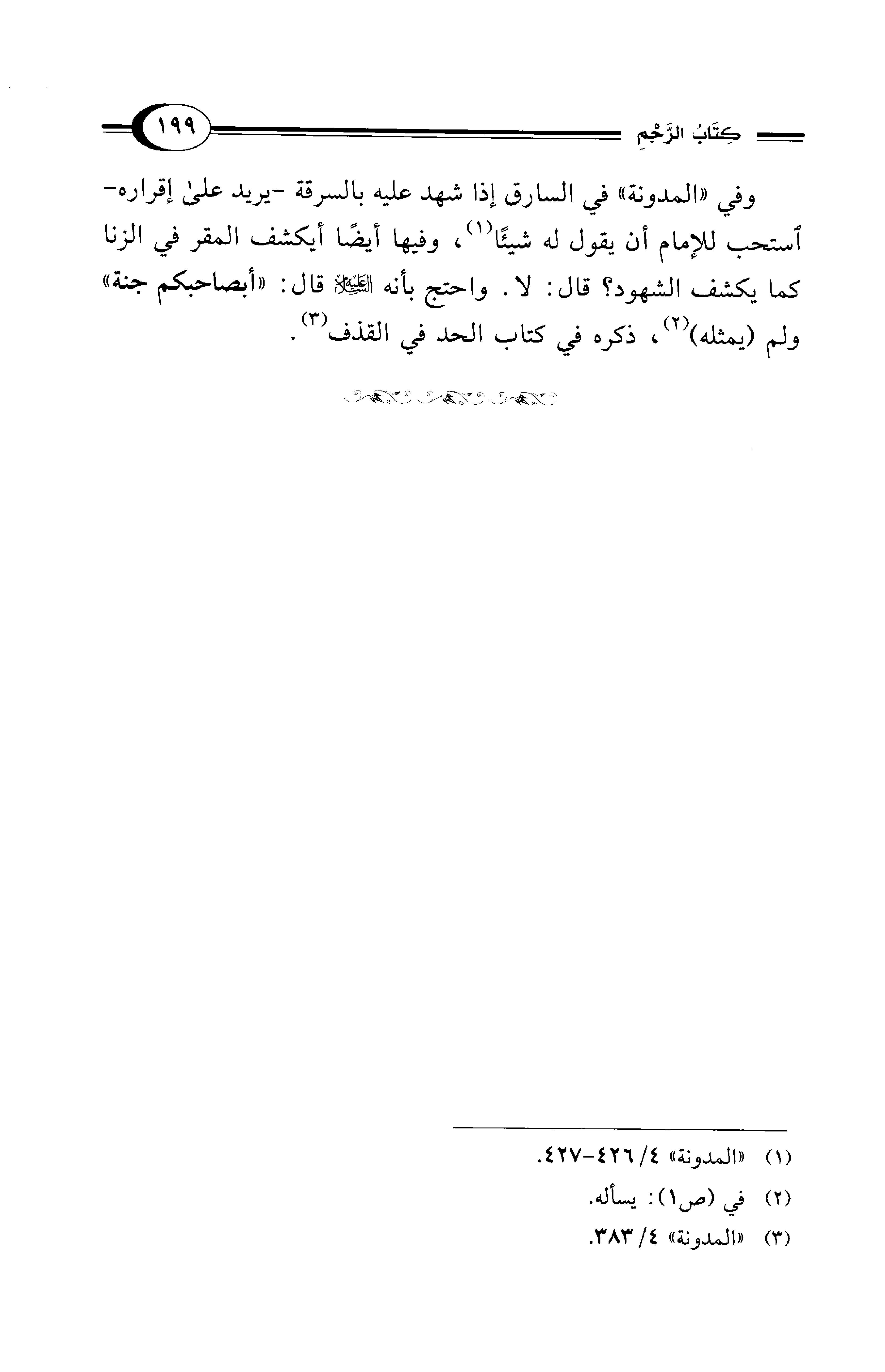 وفي "المدونة" في السارق إذا شهد عليه بالسرقة -يريد على إقراره- استحب للإمام أن يقول له شيئًا (¬1)، وفيها أيضًا أيكشف المقر في الزنا كما يكشف الشهود؟ قال: لا. واحتج بأنه - عليه السلام - قال: "أبصاحبكم جنة" ولم (يمثله) (¬2)، ذكره في كتاب الحد في القذف (¬3).