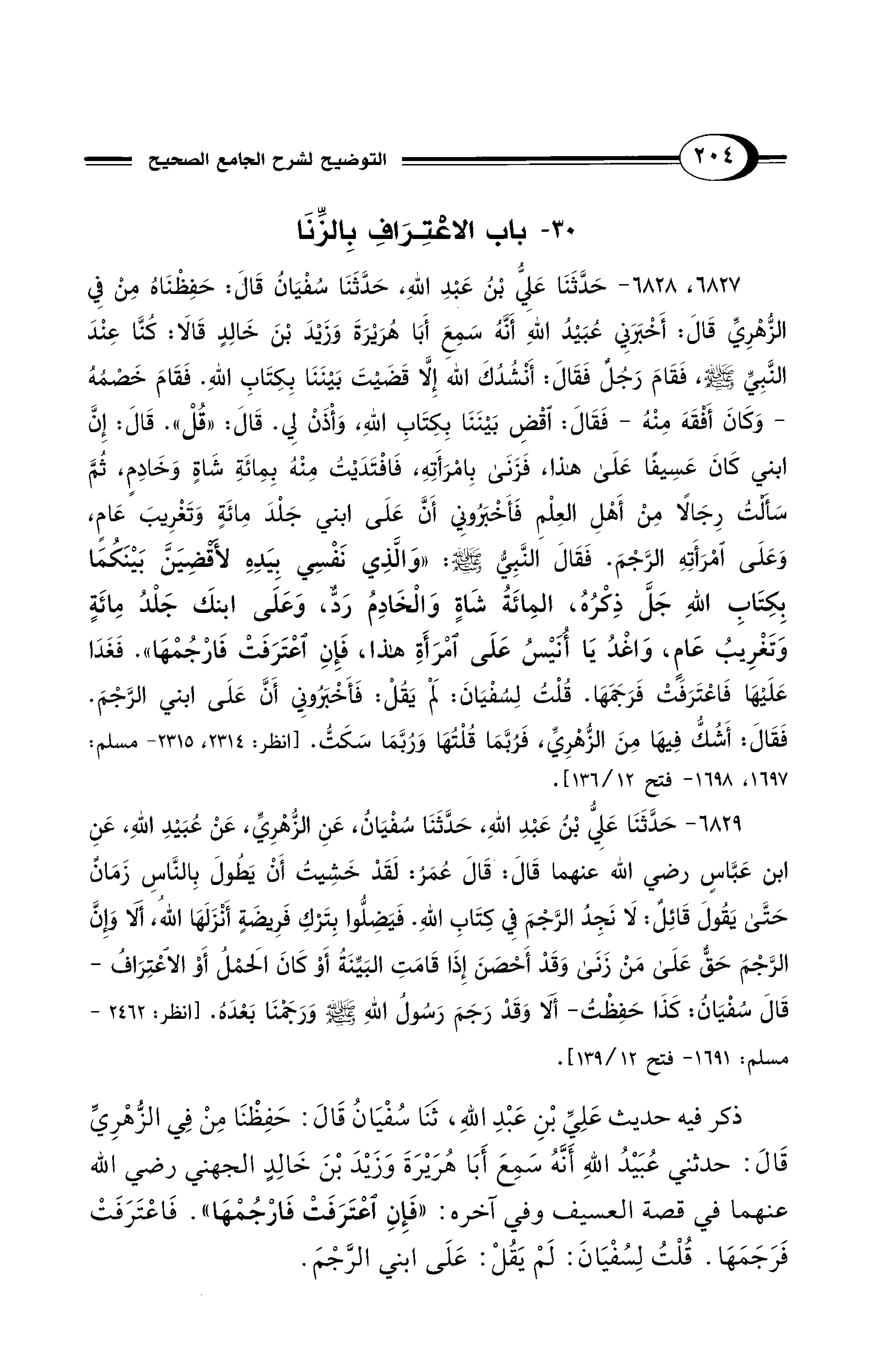 6827, 6828 - حَدَّثَنَا عَلِيُّ بْنُ عَبْدِ اللهِ، حَدَّثَنَا سُفْيَانُ قَالَ: حَفِظْنَاهُ مِنْ فِي الزُّهْرِيِّ قَالَ: أَخْبَرَنِي عُبَيْدُ اللهِ أَنَّهُ سَمِعَ أَبَا هُرَيْرَةَ وَزَيْدَ بْنَ خَالِدٍ قَالاَ: كُنَّا عِنْدَ النَّبِيِّ - صلى الله عليه وسلم -, فَقَامَ رَجُلٌ فَقَالَ أَنْشُدُكَ اللهَ إِلاَّ قَضَيْتَ بَيْنَنَا بِكِتَابِ اللهِ. فَقَامَ خَصْمُهُ -وَكَانَ أَفْقَهَ مِنْهُ- فَقَالَ اقْضِ بَيْنَنَا بِكِتَابِ اللهِ، وَأْذَنْ لِي. قَالَ: «قُلْ». قَالَ: إِنَّ ابْنِي كَانَ عَسِيفًا عَلَى هَذَا، فَزَنَى بِامْرَأَتِهِ، فَافْتَدَيْتُ مِنْهُ بِمِائَةِ شَاةٍ وَخَادِمٍ، ثُمَّ سَأَلْتُ رِجَالاً مِنْ أَهْلِ الْعِلْمِ فَأَخْبَرُونِي أَنَّ عَلَى ابْنِي جَلْدَ مِائَةٍ وَتَغْرِيبَ عَامٍ، وَعَلَى امْرَأَتِهِ الرَّجْمَ. فَقَالَ النَّبِيُّ - صلى الله عليه وسلم -: «وَالَّذِي نَفْسِي بِيَدِهِ لأَقْضِيَنَّ بَيْنَكُمَا بِكِتَابِ اللهِ جَلَّ ذِكْرُهُ، المِائَةُ شَاةٍ وَالْخَادِمُ رَدٌّ، وَعَلَى ابْنِكَ جَلْدُ مِائَةٍ وَتَغْرِيبُ عَامٍ، وَاغْدُ يَا أُنَيْسُ عَلَى امْرَأَةِ هَذَا، فَإِنِ اعْتَرَفَتْ فَارْجُمْهَا». فَغَدَا عَلَيْهَا فَاعْتَرَفَتْ فَرَجَمَهَا. قُلْتُ لِسُفْيَانَ: لَمْ يَقُلْ: فَأَخْبَرُونِي أَنَّ عَلَى ابْنِي الرَّجْم. فَقَالَ: أَشُكُّ فِيهَا مِنَ الزُّهْرِيِّ، فَرُبَّمَا قُلْتُهَا وَرُبَّمَا سَكَتُّ. [انظر: 2314، 2315 - مسلم: