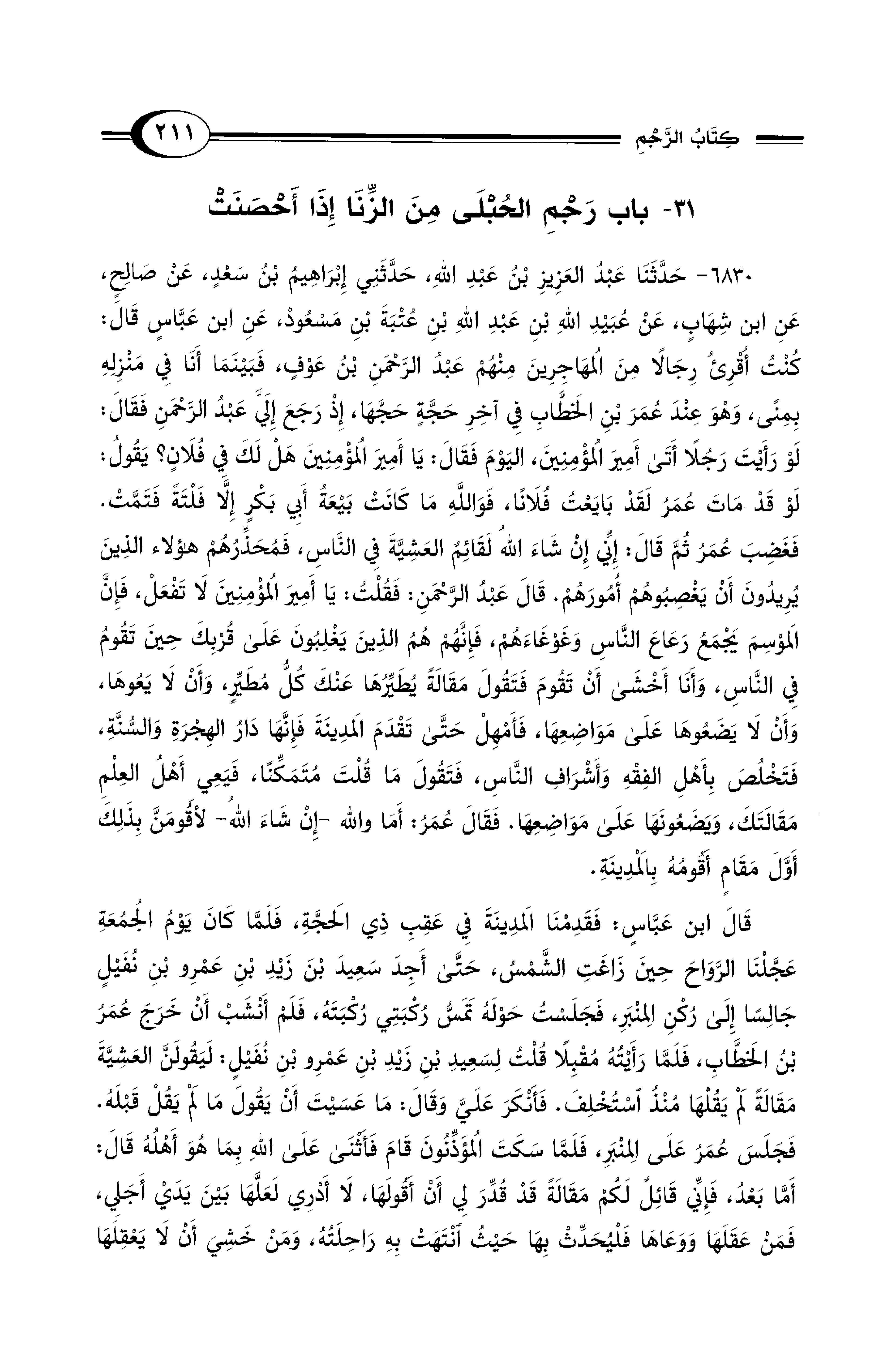 - 6830 - حَدَّثَنَا عَبْدُ الْعَزِيزِ بْنُ عَبْدِ اللهِ، حَدَّثَنِي إِبْرَاهِيمُ بْنُ سَعْد، عَنْ صَالِحٍ، عَنِ ابْنِ شِهَابٍ، عَنْ عُبَيْدِ اللهِ بْنِ عَبْدِ اللهِ بْنِ عُتْبَةَ بْنِ مَسْعُودٍ، عَنِ ابْنِ عَبَّاسٍ قَالَ: كُنْتُ أُقْرِئُ رِجَالاً مِنَ الْمُهَاجِرِينَ مِنْهُمْ عَبْدُ الرَّحْمَنِ بْنُ عَوْفٍ،، فَبَيْنَمَا أَنَا فِي مَنْزِلِهِ بِمِنًى، وَهْوَ عِنْدَ عُمَرَ بْنِ الْخَطَّابِ فِي آخِرِ حَجَّةٍ حَجَّهَا، إِذْ رَجَعَ إِلَيَّ عَبْدُ الرَّحْمَنِ فَقَالَ: لَوْ رَأَيْتَ رَجُلاً أَتَى أَمِيرَ الْمُؤْمِنِينَ، اليَوْمَ فَقَالَ: يَا أَمِيرَ الْمُؤْمِنِينَ هَلْ لَكَ فِي فُلاَن؟ يَقُولُ: لَوْ قَدْ مَاتَ عُمَرُ لَقَدْ بَايَعْتُ فُلاَنًا، فَوَاللهِ مَا كَانَتْ بَيْعَةُ أَبِي بَكْرٍ إِلاَّ فَلْتَةً فَتَمَّتْ.