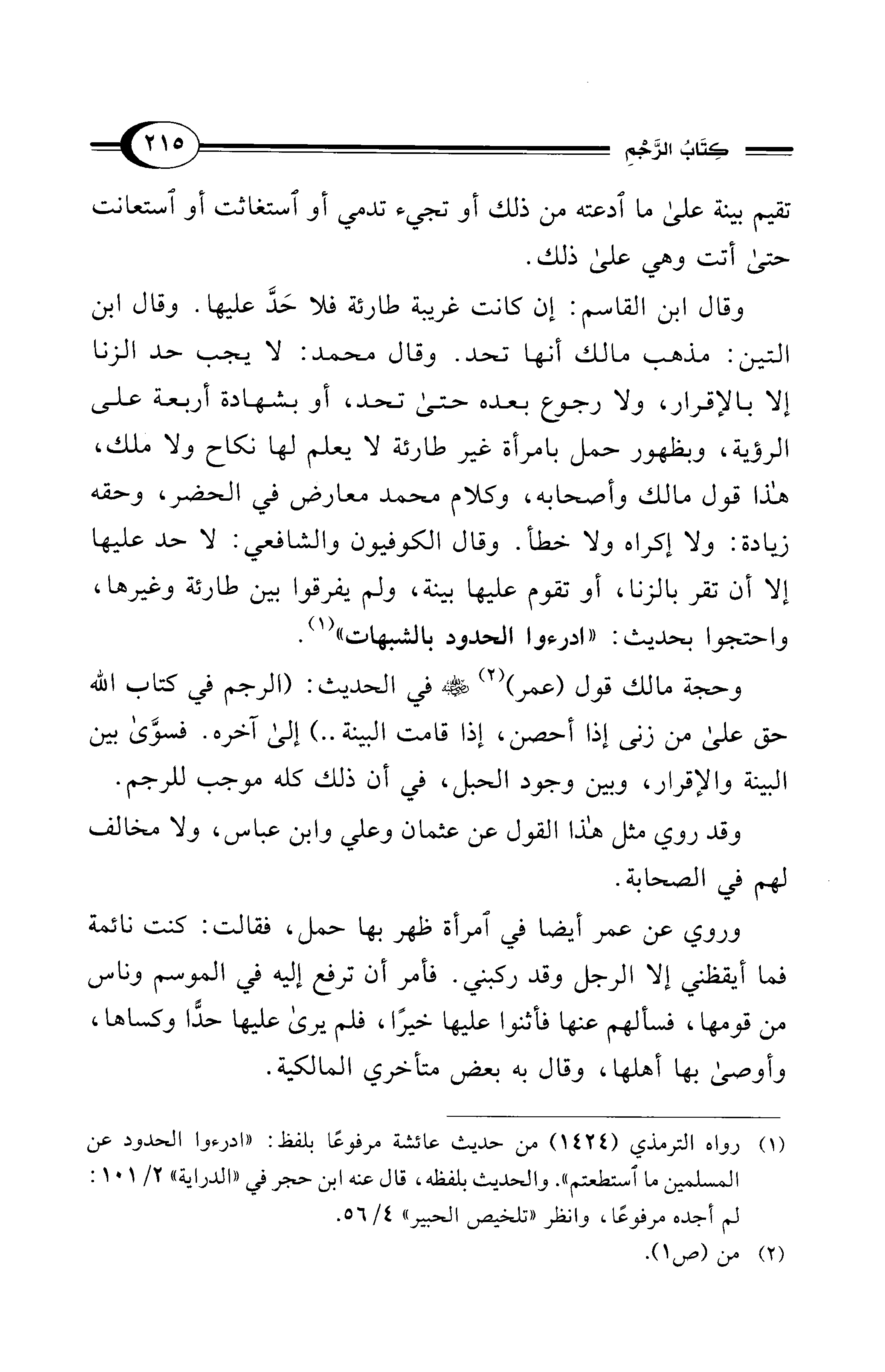 وقال ابن القاسم: إن كانت غريبة طارئة فلا حَدَّ عليها. وقال ابن التين: مذهب مالك أنها تحد. وقال محمد: لا يجب حد الزنا إلا بالإقرار، ولا رجوع بعده حتى تحد، أو بشهادة أربعة على الرؤية، وبظهور حمل بامرأة غير طارئة لا يعلم لها نكاح ولا ملك، هذا قول مالك وأصحابه، وكلام محمد معارض في الحضر، وحقه زيادة: ولا إكراه ولا خطأ. وقال الكوفيون والشافعي: لا حد عليها إلا أن تقر بالزنا، أوتقوم عليها بينة، ولم يفرقوا بين طارئة وغيرها، واحتجوا بحديث: "ادرءوا الحدود بالشبهات" (¬1).