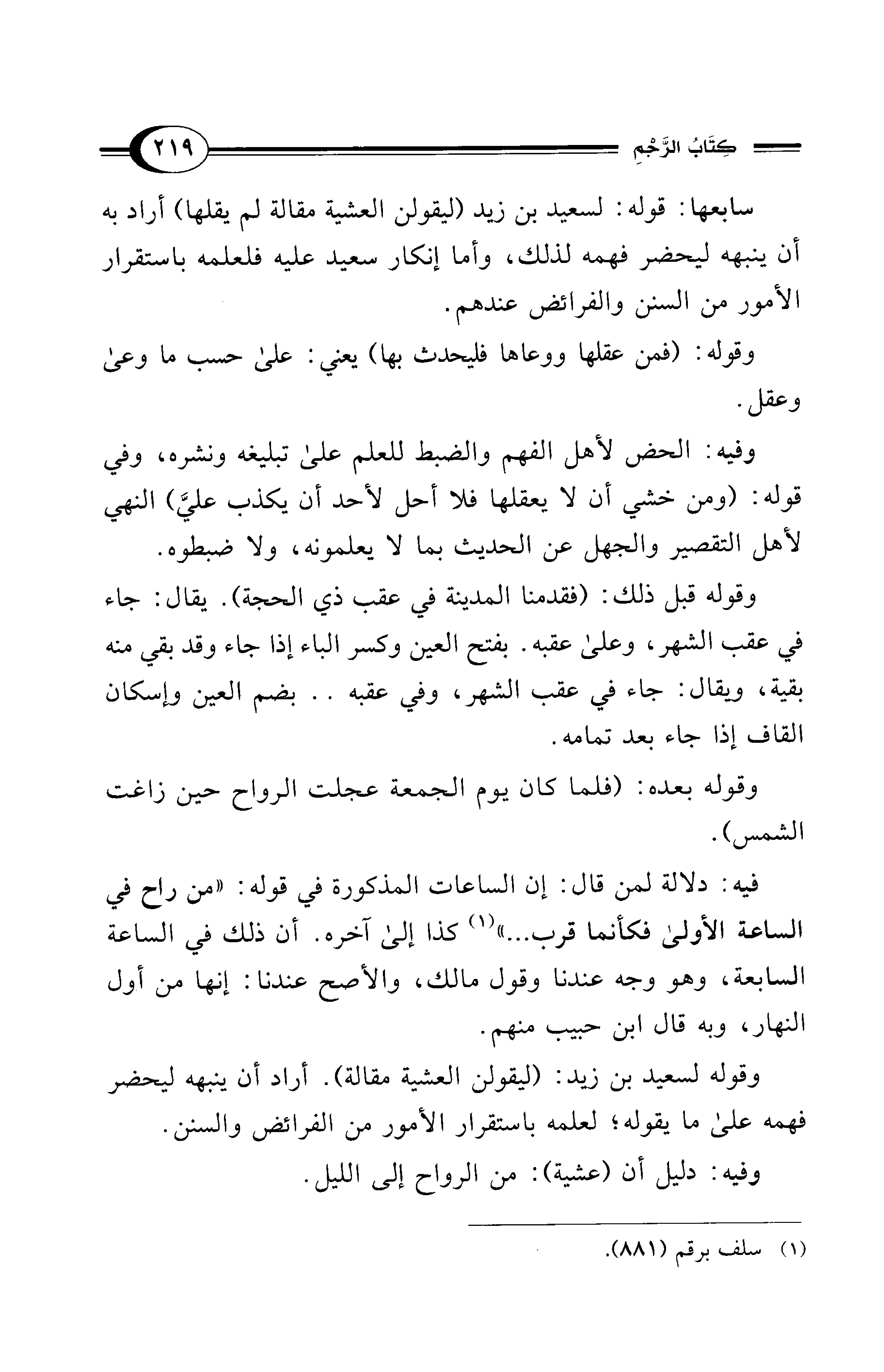 فيه: دلالة لمن قال: إن الساعات المذكورة في قوله: "من راح في الساعة الأولى فكأنما قرب ... " (¬1) كذا إلى آخره. أن ذلك في الساعة السابعة، وهو وجه عندنا وقول مالك، والأصح عندنا: إنها من أول النهار، وبه قال ابن حبيب منهم.