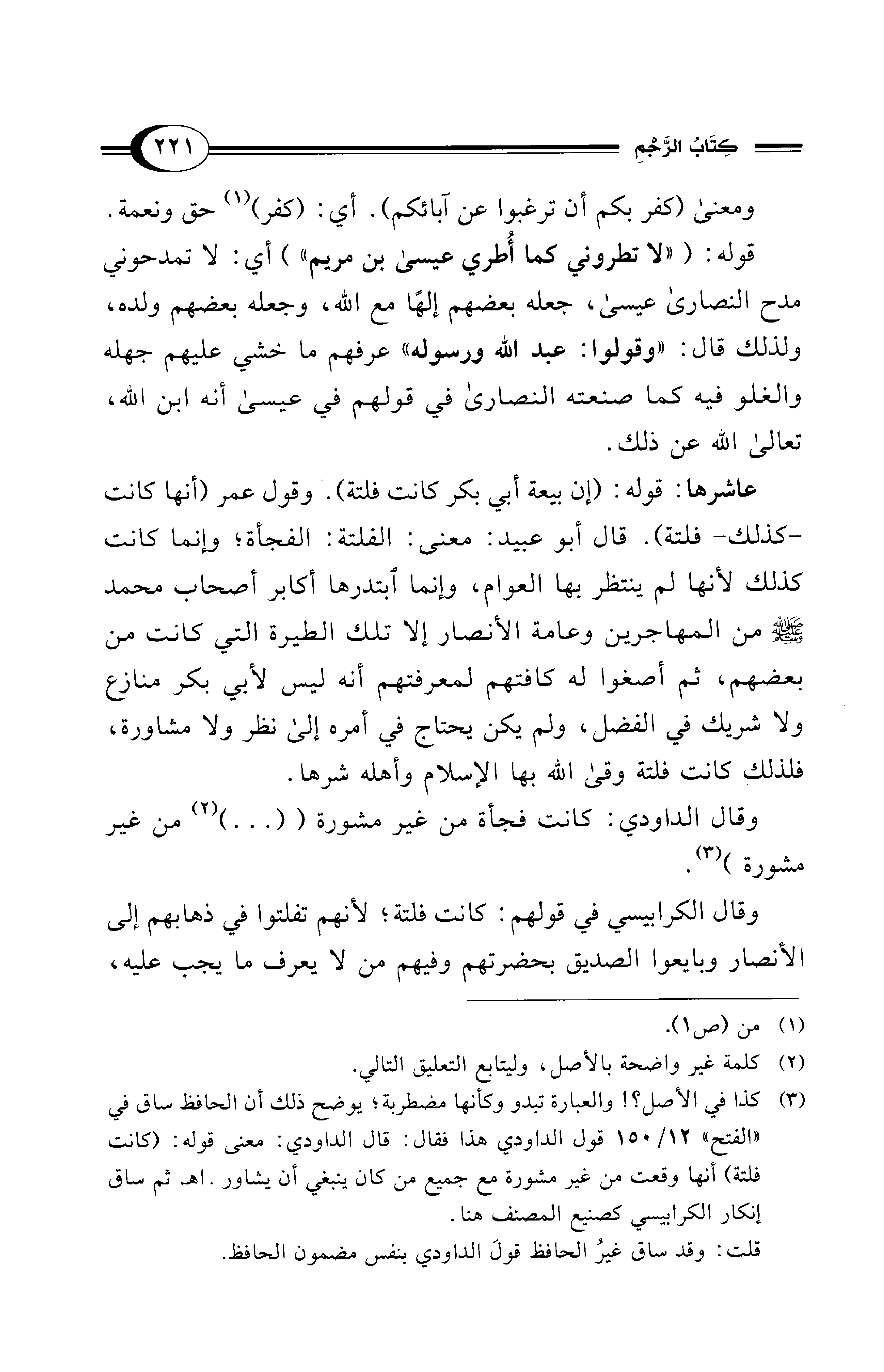 (¬3) كذا في الأصل؟! والعبارة تبدو وكأنها مضطربة؛ يوضح ذلك أن الحافظ ساق في "الفتح" 12/ 150 قول الداودي هذا فقال: قال الداودي: معنى قوله: (كانت فلتة) أنها وقعت من غير مشورة مع جميع من كان ينبغي أن يشاور. اهـ. ثم ساق إنكار الكرابيسي كصنيع المصنف هنا.