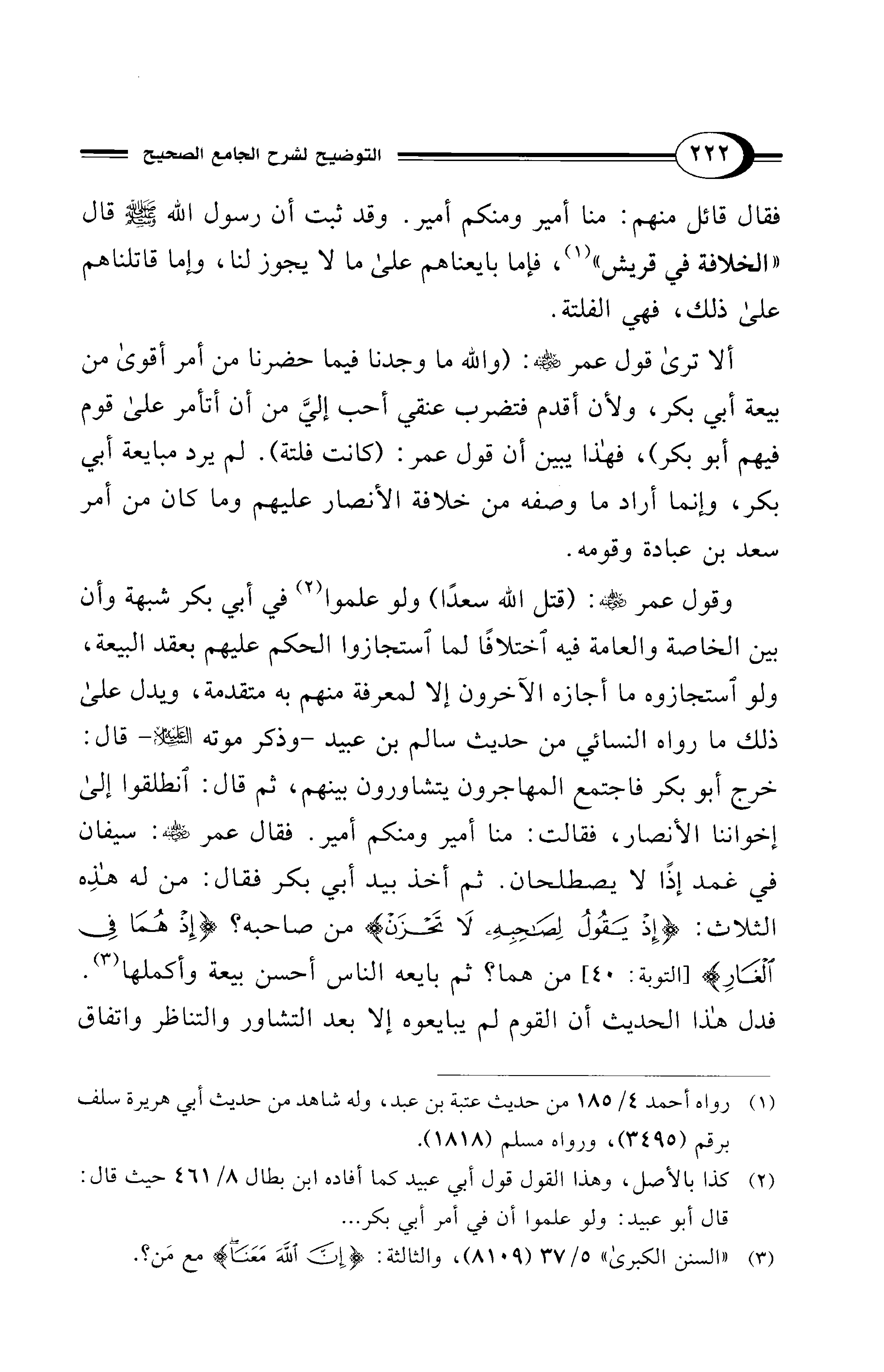 وقول عمر - رضي الله عنه -: (قتل الله سعدًا) ولو علموا (¬2) في أبي بكر شبهة وأن بين الخاصة والعامة فيه اختلافًا لما استجازوا الحكم عليهم بعقد البيعة، ولو استجازوه ما أجازه الآخرون إلا لمعرفة منهم به متقدمة، ويدل على ذلك ما رواه النسائي من حديث سالم بن عبيد -وذكر موته - عليه السلام - قال: خرج أبو بكر فاجتمع المهاجرون يتشاورون بينهم، ثم قال: انطلقوا إلى إخواننا الأنصار، فقالت: منا أمير ومنكم أمير. فقال عمر- رضي الله عنه -: سيفان في غمد إذًا لا يصطلحان. ثم أخذ بيد أبي بكر فقال: من له هذِه الثلاث: {إِذ يَقُولُ لِصَاحِبِهِ لَا تَحْزَنْ} من صاحبه؟ {إِذْ هُمَا فِي الْغَارِ} [التوبة: 40] من هما؟ ثم بايعه الناس أحسن بيعة وأكملها (¬3).