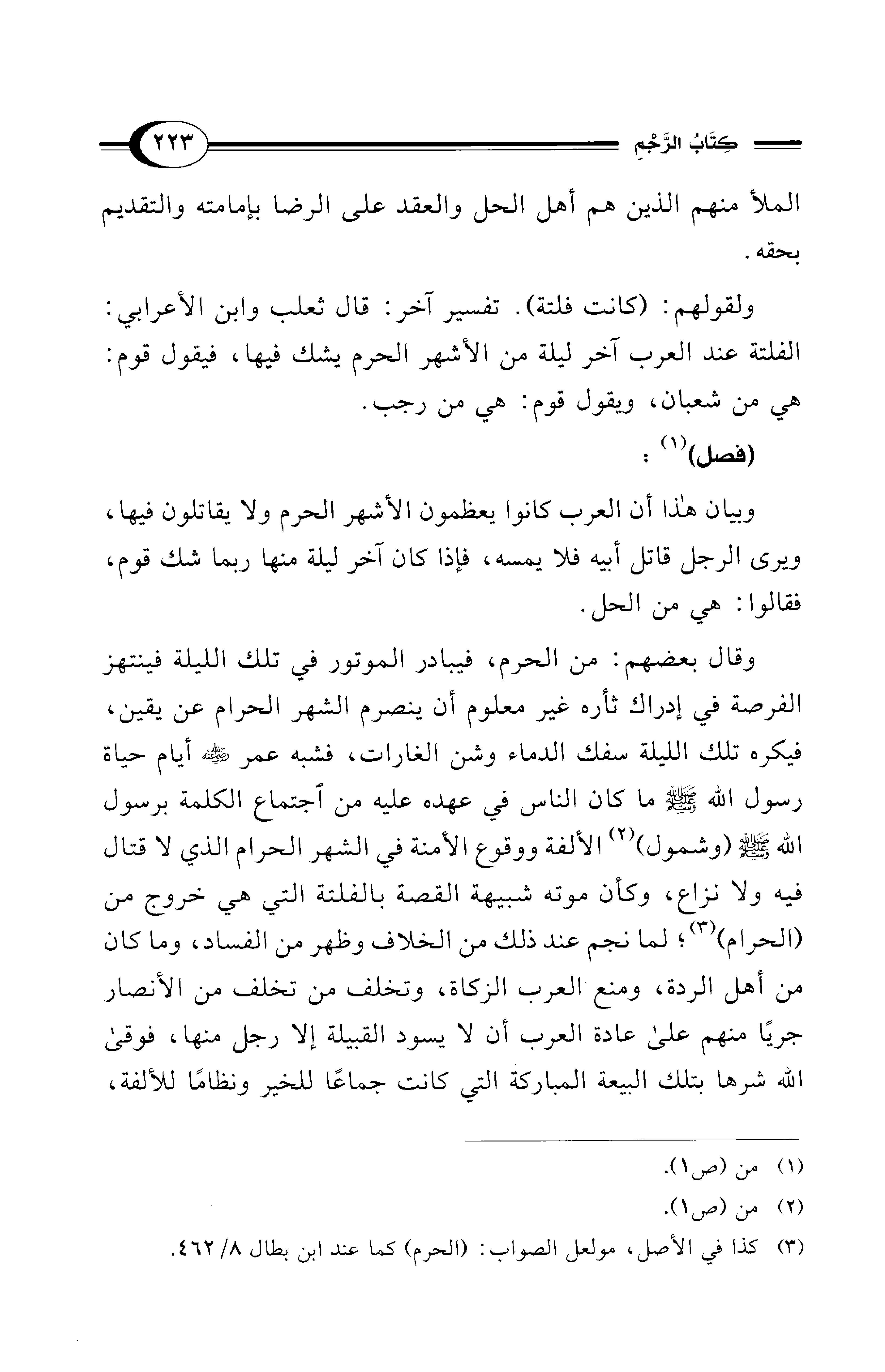 وقال بعضهم: من الرحم، فيبادر الموتور في تلك الليلة فينتهز الفرصة في إدارك ثأره غير معلوم أن ينصرم الشهر الحرام على عن يقين، فيكره تلك الليلة سفك الدماء وشن الغارات، فشبه عمر- رضي الله عنه - أيام حياة رسول الله - صلى الله عليه وسلم - ما كان الناس في عهده عليه من اجتماع الكلمة برسول الله" - صلى الله عليه وسلم - (وشمول) (¬2) الألفة ووقوع الأمنة في الشهر الحرام الذي لا قتال فيه ولا نزاع، وكأن موته شبيهة القصة بالفلتة التي هي خروج من (الحرام) (¬3)؛ لما نجم عند ذلك من الخلاف وظهر من الفساد، وما كان من أهل الردة، ومنع العرب الزكاة، وتخلف من تخلف من الأنصار جريًا منهم على عادة العرب أن لا يسود القبيلة إلا رجل منها، فوقى الله شرها بتلك البيعة المباركة التي كانت جماعًا للخير ونظامًا للألفة،