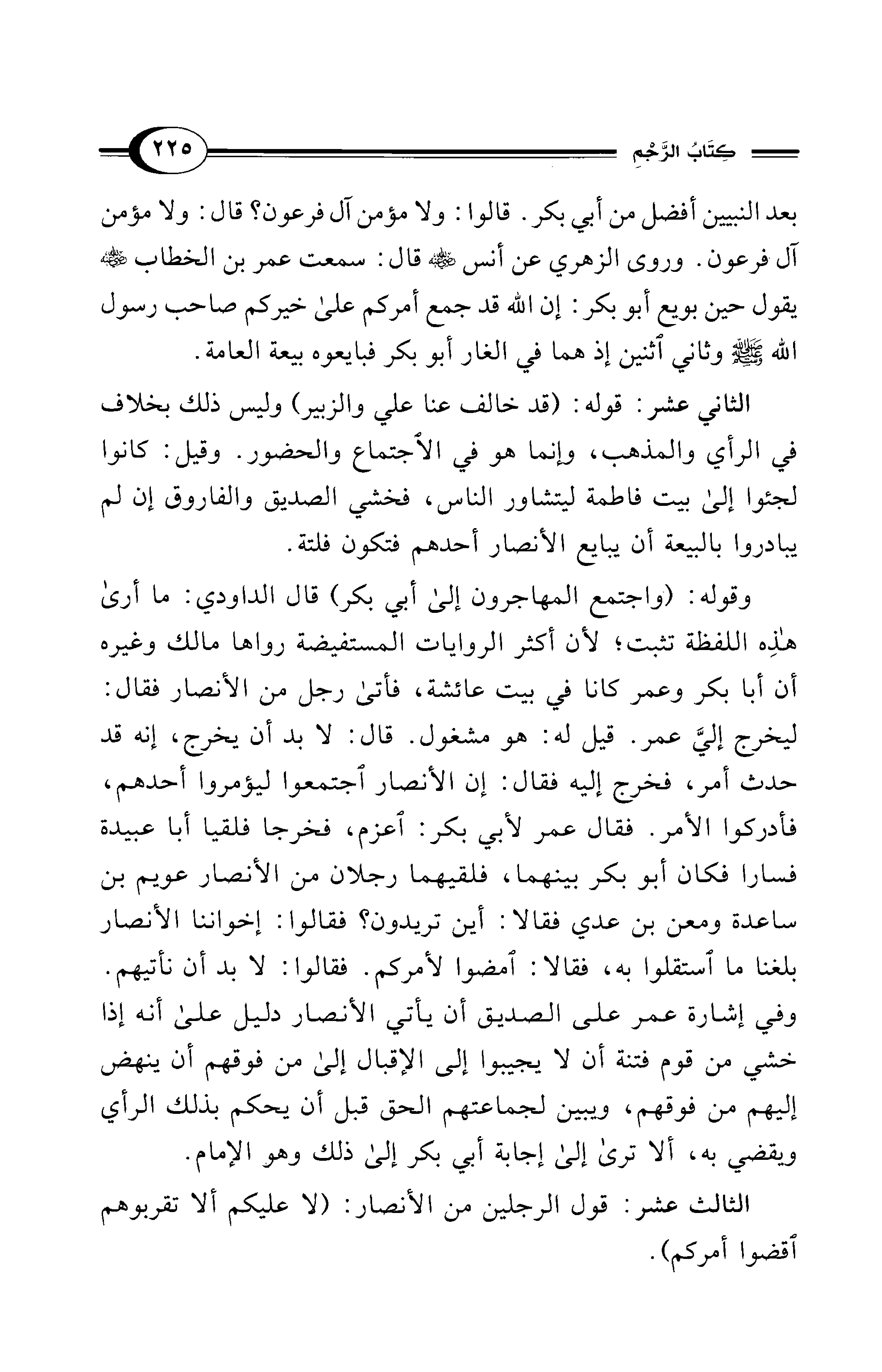 الثاني عشر: قوله: (قد خالف عنا علي والزبير) وليس ذلك بخلاف في الرأي والمذهب، وإنما هو في الاجتماع والحضور. وقيل: كانوا لجئوا إلى بيت فاطمة ليتشاور الناس، فخشي الصديق والفاروق إن لم يبادروا بالبيعة أن يبايع الأنصار أحدهم فتكون فلتة.