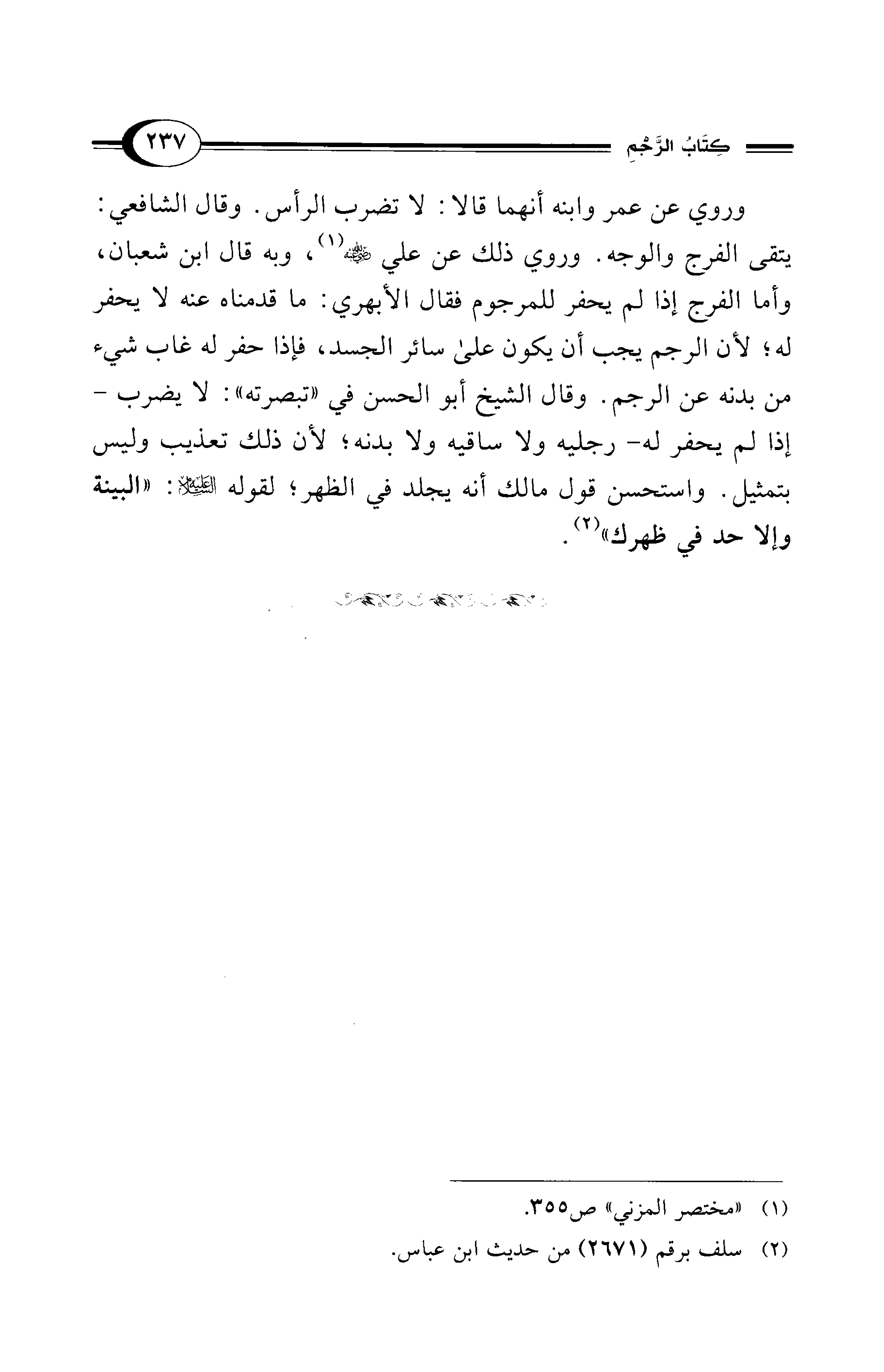 وروي عن عمر وابنه أنهما قالا: لا تضرب الرأس. وقال الشافعي: يتقى الفرج والوجه. وروي ذلك عن علي - رضي الله عنه - (¬1)، وبه قال ابن شعبان، وأما الفرج إذا لم يحفر للمرجوم فقال الأبهري: ما قدمناه عنه لا يحفر له؛ لأن الرجم يجب أن يكون علي سائر الجسد، فإذا حفر له غاب شيء من بدنه عن الرجم. وقال الشيخ أبو الحسن في "تبصرته": لا يضرب -إذا لم يحفر له- رجليه ولا ساقيه ولا بدنه؛ لأن ذلك تعذيب وليس بتمثيل. واستحسن قول مالك أنه يجلد في الظهر؛ لقوله - عليه السلام -: "البينة وإلا حد في ظهرك" (¬2).