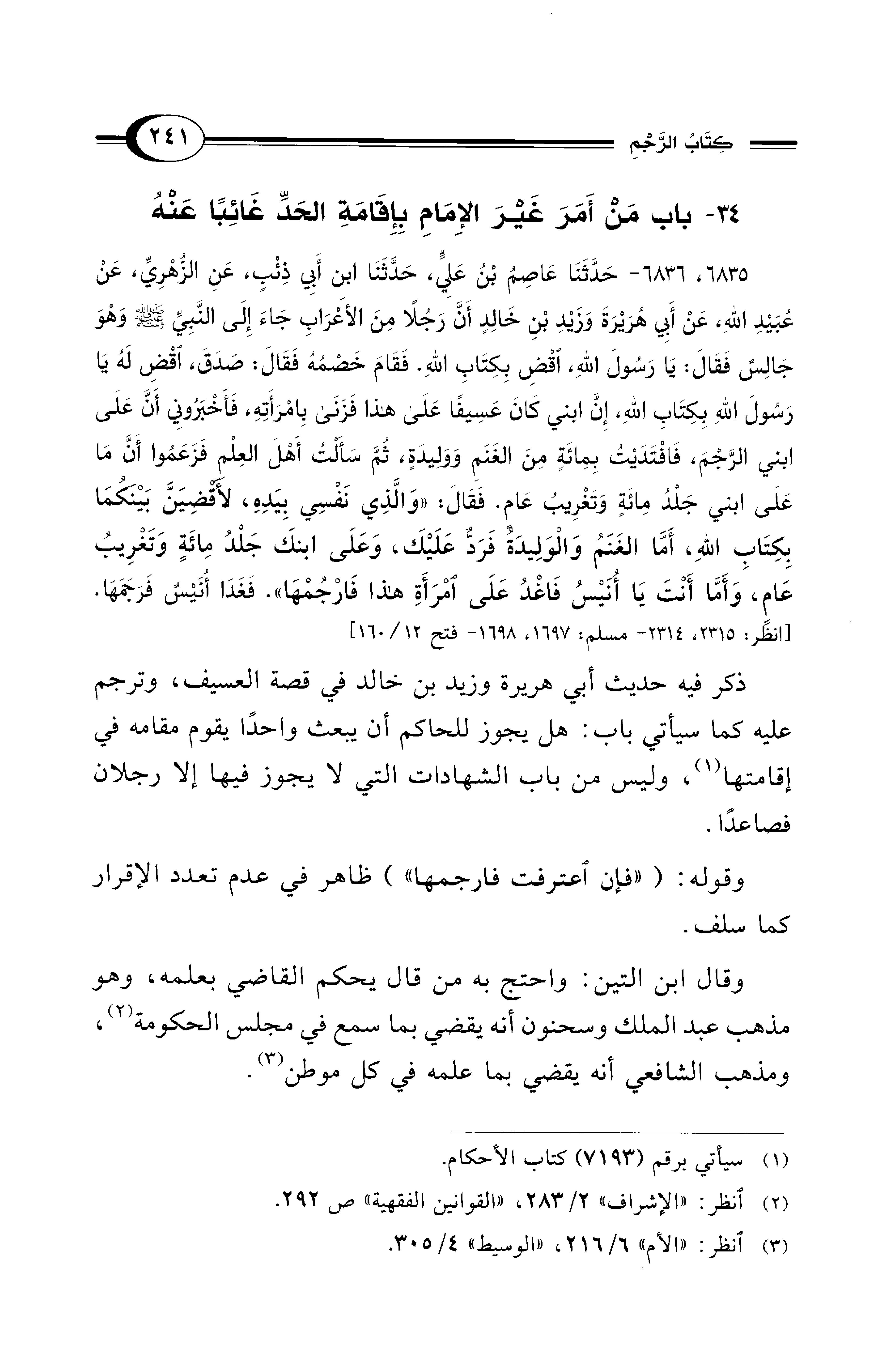 6835، 6836 - حَدَّثَنَا عَاصِمُ بْنُ عَلِيٍّ، حَدَّثَنَا ابْنُ أَبِي ذِئْبٍ، عَنِ الزُّهْرِيِّ، عَنْ عُبَيْدِ اللهِ، عَنْ أَبِي هُرَيْرَةَ وَزَيْدِ بْنِ خَالِدٍ أَنَّ رَجُلاً مِنَ الأَعْرَابِ جَاءَ إِلَى النَّبِيِّ - صلى الله عليه وسلم - وَهْوَ جَالِسٌ فَقَالَ: يَا رَسُولَ اللهِ، اقْضِ بِكِتَابِ اللهِ. فَقَامَ خَصْمُهُ فَقَالَ: صَدَقَ، اقْضِ لَهُ يَا رَسُولَ اللهِ بِكِتَابِ اللهِ، إِنَّ ابْنِي كَانَ عَسِيفًا عَلَى هَذَا فَزَنَى بِامْرَأَتِهِ، فَأَخْبَرُونِي أَنَّ عَلَى ابْنِي الرَّجْمَ، فَافْتَدَيْتُ بِمِائَةٍ مِنَ الْغَنَمِ وَوَلِيدَةٍ، ثُمَّ سَأَلْتُ أَهْلَ الْعِلْمِ فَزَعَمُوا أَنَّ مَا عَلَى ابْنِي جَلْدُ مِائَةٍ وَتَغْرِيبُ عَامٍ. فَقَالَ: «وَالَّذِي نَفْسِي بِيَدِهِ، لأَقْضِيَنَّ بَيْنَكُمَا بِكِتَابِ اللهِ، أَمَّا الْغَنَمُ وَالْوَلِيدَةُ فَرَدٌّ عَلَيْكَ، وَعَلَى ابْنِكَ جَلْدُ مِائَةٍ وَتَغْرِيبُ عَامٍ، وَأَمَّا أَنْتَ يَا أُنَيْسُ فَاغْدُ عَلَى امْرَأَةِ هَذَا فَارْجُمْهَا». فَغَدَا أُنَيْسٌ فَرَجَمَهَا. [انظر: 2315، 2314 - مسلم: 1697، 1698 - فتح 12/ 160]