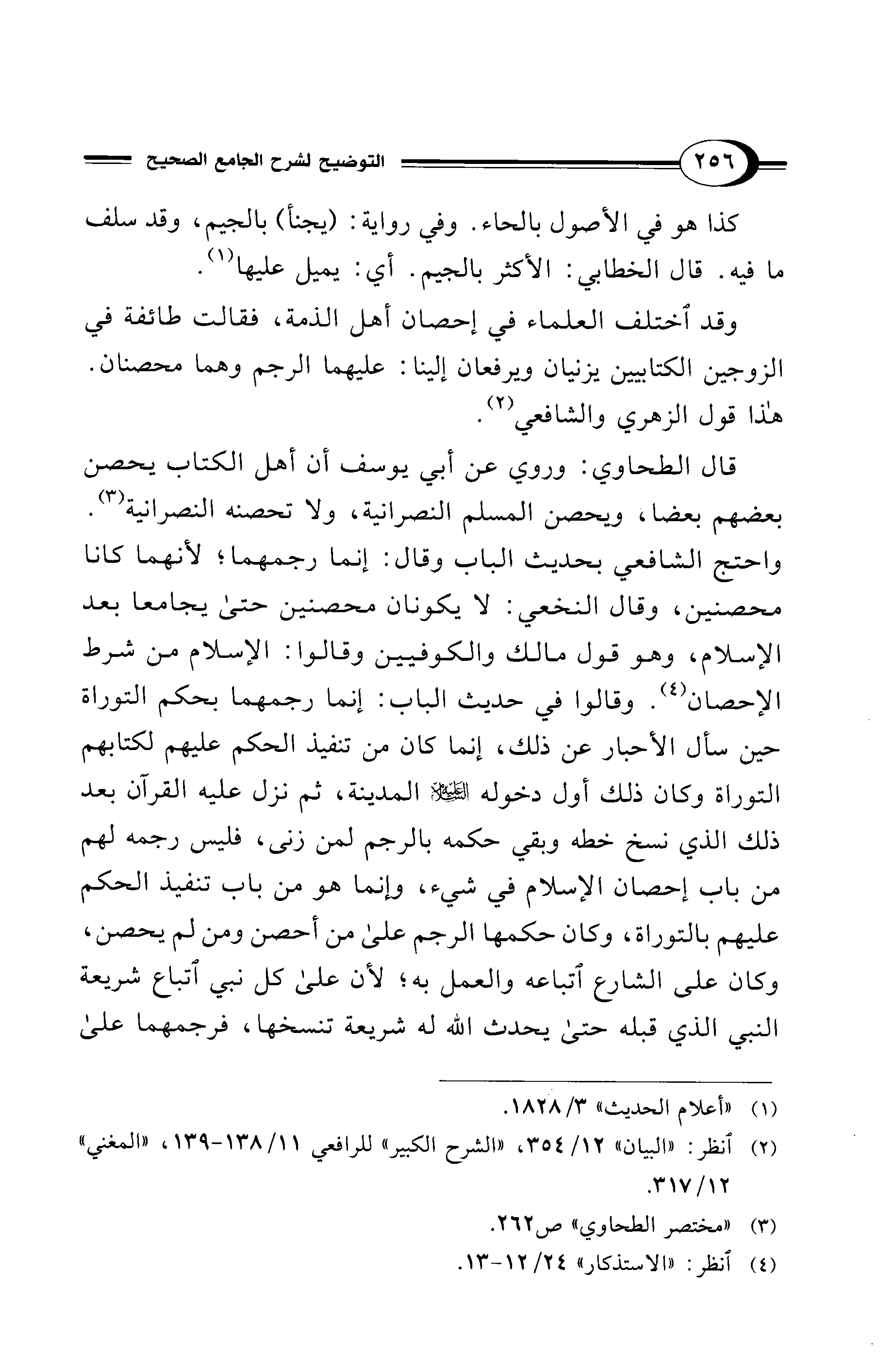 قال الطحاوي: وروي عن أبي يوسف أن أهل الكتاب يحصن بعضهم بعضا، ويحصن المسلم النصرانية، ولا تحصنه النصرانية (¬3). واحتج الشافعي بحديث الباب وقال: إنما رجمهما؛ لأنهما كانا محصنين، وقال النخعي: لا يكونان محصنين حتى يجامعا بعد الإسلام، وهو قول مالك والكوفيين وقالوا: الإسلام من شرط الإحصان (¬4). وقالوا في حديث الباب: إنما رجمهما بحكم التوراة حين سأل الأحبار عن ذلك، إنما كان من تنفيذ الحكم عليهم لكتابهم التوراة وكان ذلك أول دخوله - عليه السلام - المدينة، ثم نزل عليه القرآن بعد ذلك الذي نسخ خطه وبقي حكمه بالرجم لمن زنى، فليس رجمه لهم من باب إحصان الإسلام في شيء، وإنما هو من باب تنفيذ الحكم عليهم بالتوراة، وكان حكمها الرجم على من أحصن ومن لم يحصن، وكان على الشارع اتباعه والعمل به؛ لأن على كل نبي اتباع شريعة النبي الذي قبله حتى يحدث الله له شريعة تنسخها، فرجمهما على