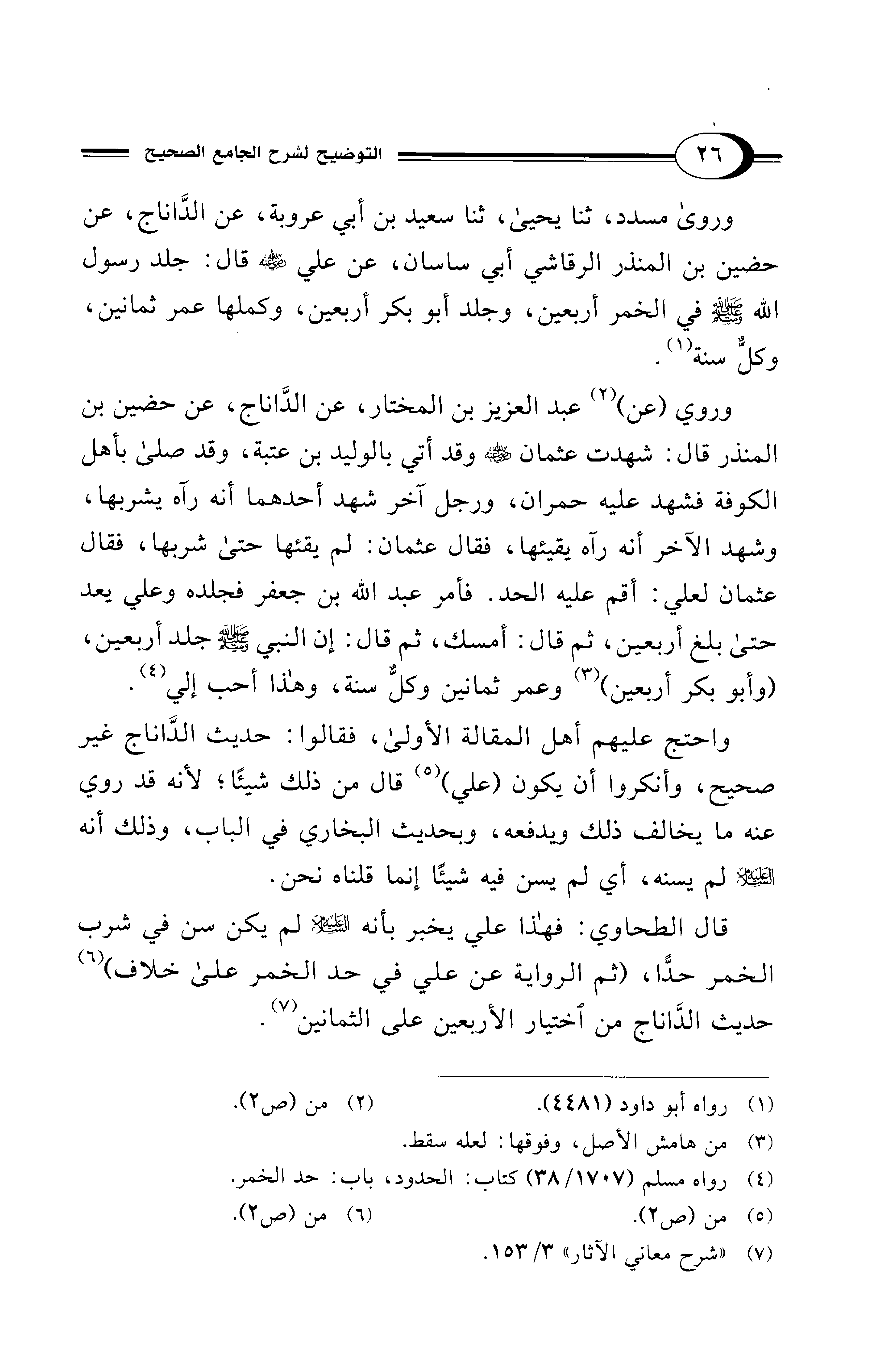 قال الطحاوي: فهذا علي يخبر بأنه - عليه السلام - لم يكن سن في شرب الخمر حدًّا، (ثم الرواية عن علي في حد الخمر على خلاف) (¬6) حديث الدَّاناج من اختيار الأربعين على الثمانين (¬7).