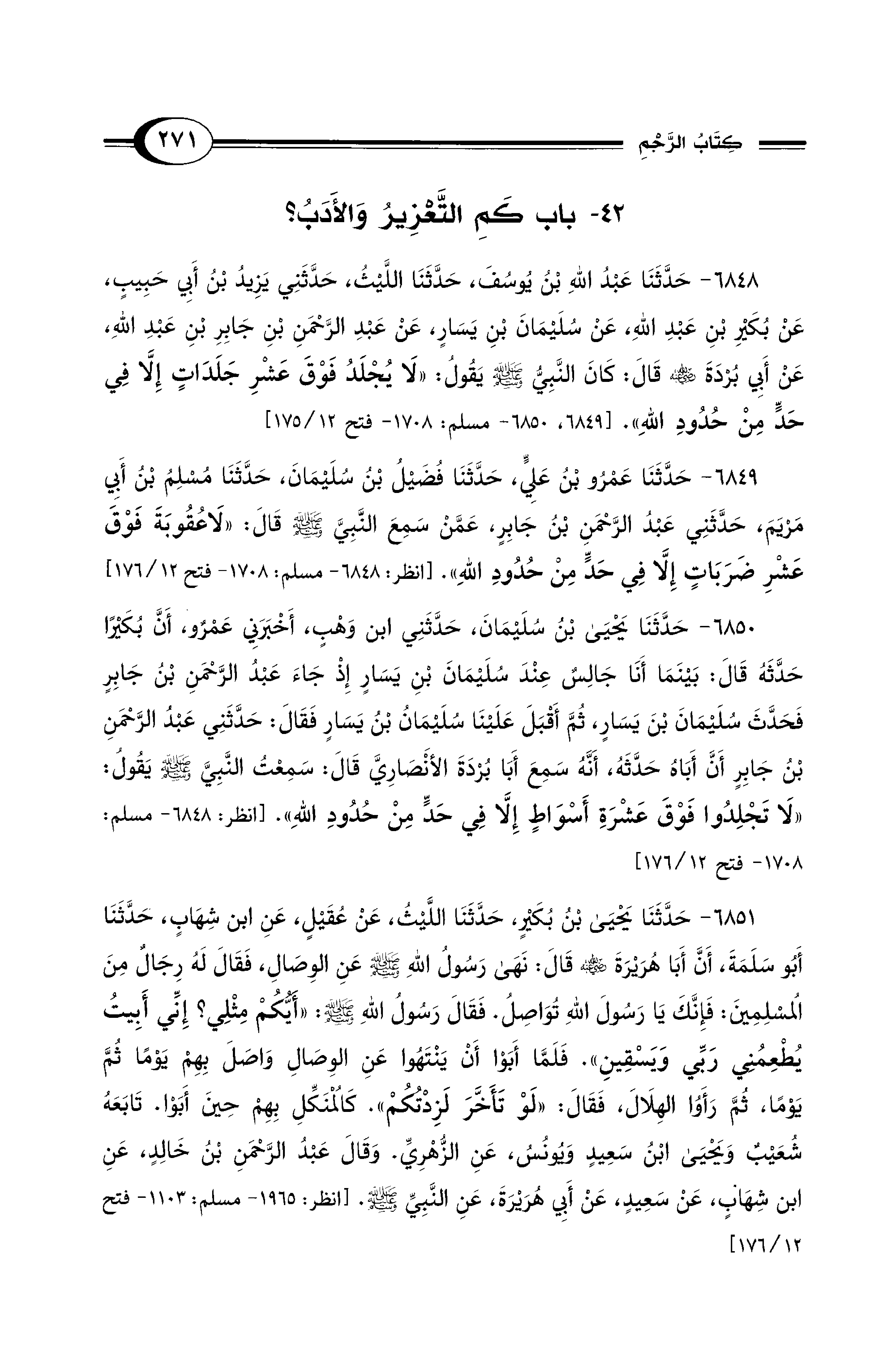6850 - حَدَّثَنَا يَحْيَى بْنُ سُلَيْمَانَ، حَدَّثَنِي ابْنُ وَهْبٍ، أَخْبَرَنِي عَمْرٌو، أَنَّ بُكَيْرًا، حَدَّثَهُ قَالَ: بَيْنَمَا أَنَا جَالِسٌ عِنْدَ سُلَيْمَانَ بْنِ يَسَارٍ إِذْ جَاءَ عَبْدُ الرَّحْمَنِ بْنُ جَابِرٍ فَحَدَّثَ سُلَيْمَانَ بْنَ يَسَارٍ، ثُمَّ أَقْبَلَ عَلَيْنَا سُلَيْمَانُ بْنُ يَسَارٍ فَقَالَ: حَدَّثَنِي عَبْدُ الرَّحْمَنِ بْنُ جَابِرٍ أَنَّ أَبَاهُ حَدَّثَهُ، أَنَّهُ سَمِعَ أَبَا بُرْدَةَ الأَنْصَارِيَّ قَالَ: سَمِعْتُ النَّبِيَّ - صلى الله عليه وسلم - يَقُولُ: «لاَ تَجْلِدُوا فَوْقَ عَشْرَةِ أَسْوَاطٍ إِلاَّ فِي حَدٍّ مِنْ حُدُودِ اللهِ». [انظر: 6848 - مسلم: 1708 - فتح 12/ 176]