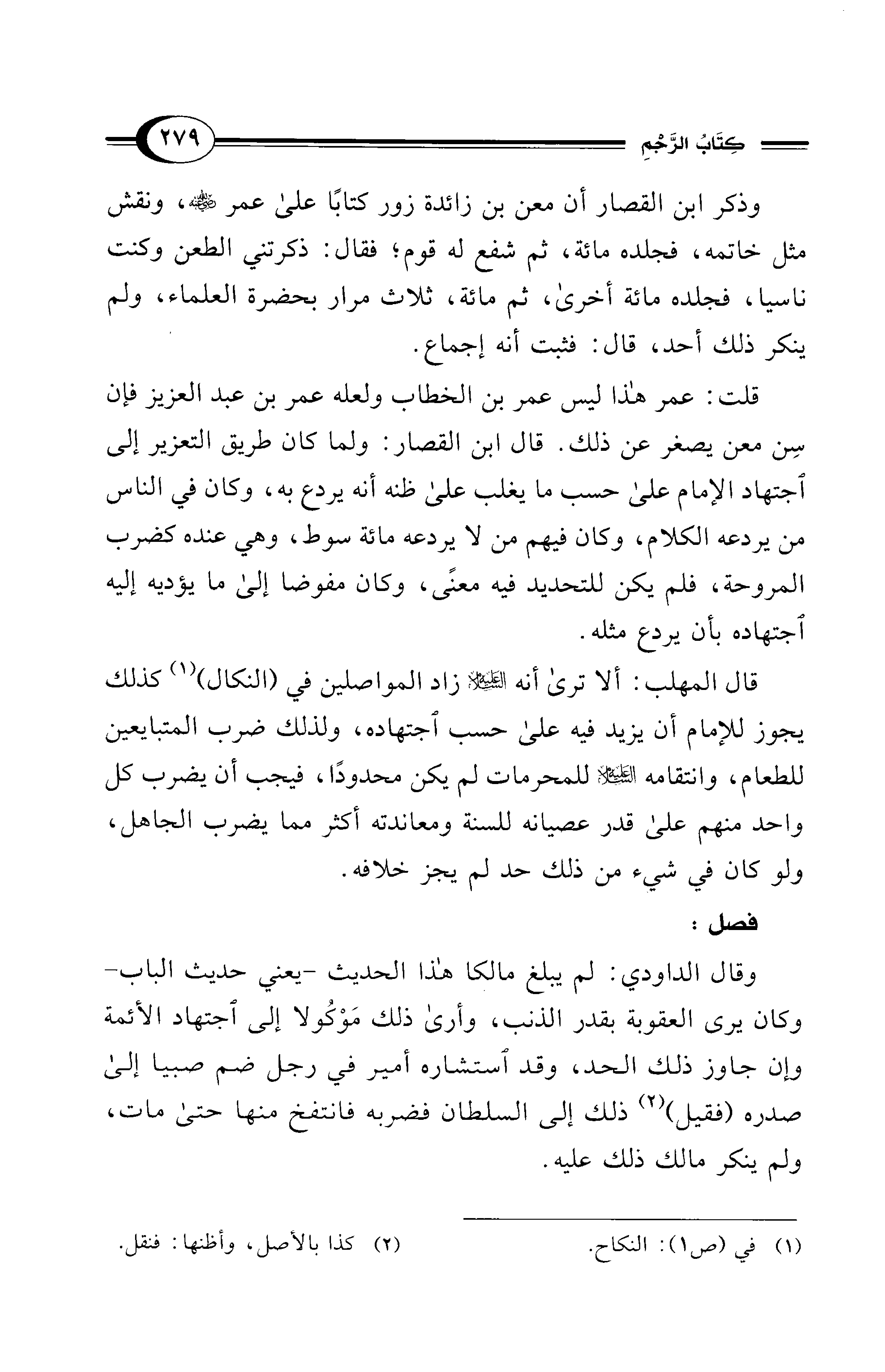 قلت: عمر هذا ليس عمر بن الخطاب ولعله عمر بن عبد العزيز فإن سِن معن يصغر عن ذلك. قال ابن القصار: ولما كان طريق التعزير إلى اجتهاد الإمام على حسب ما يغلب على ظنه أنه يردع به، وكان في الناس من يردعه الكلام، وكان فيهم من لا يردعه مائة سوط، وهي عنده كضرب المروحة، فلم يكن للتحديد فيه معنًى، وكان مفوضا إلى ما يؤديه إليه اجتهاده بأن يردع مثله.