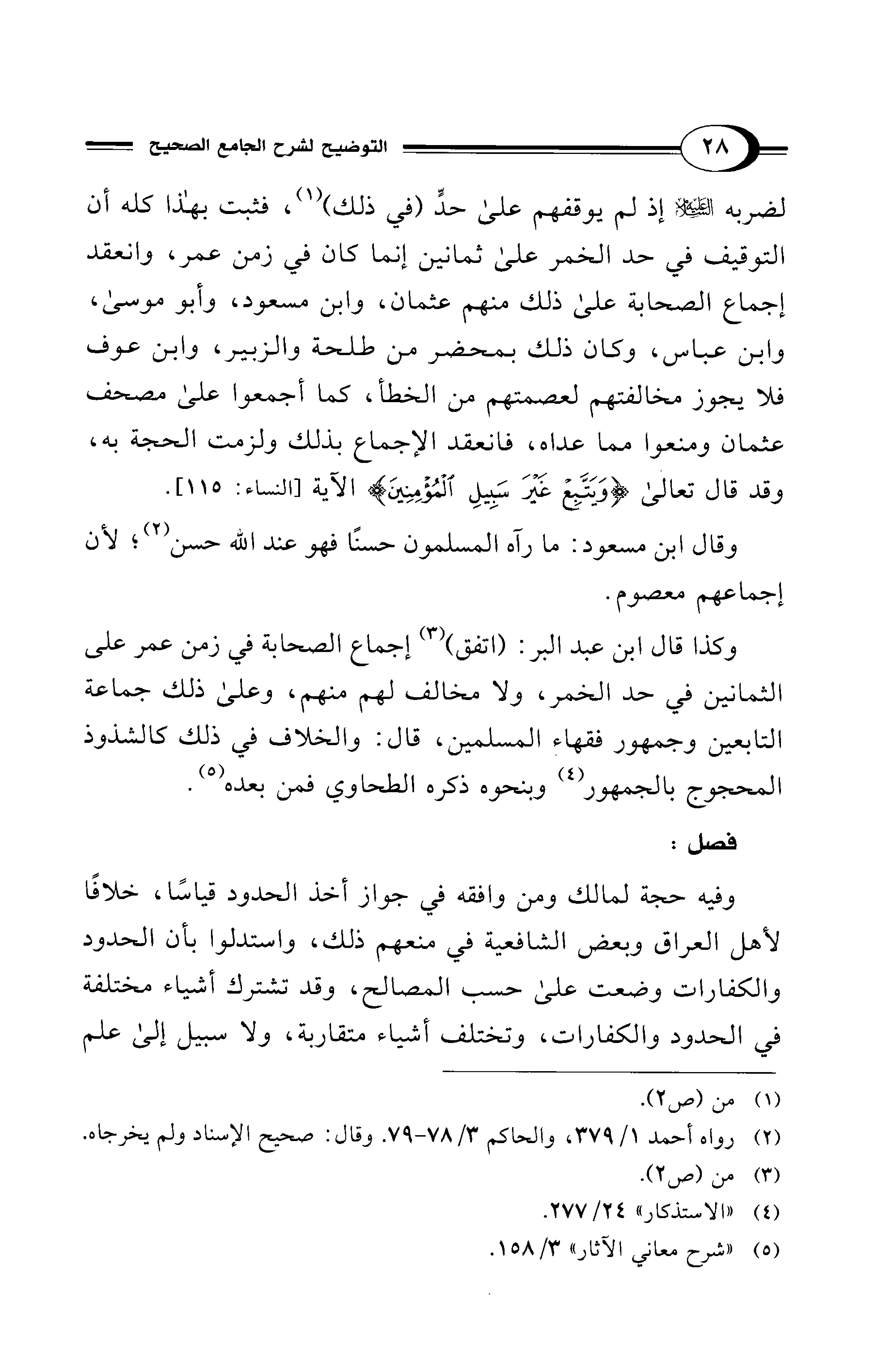 وكذا قال ابن عبد البر: (اتفق) (¬3) إجماع الصحابة في زمن عمر على الثمانين في حد الخمر، ولا مخالف لهم منهم، وعلى ذلك جماعة التابعين وجمهور فقهاء المسلمين، قال: والخلاف في ذلك كالشذوذ المحجوج بالجمهور (¬4) وبنحوه ذكره الطحاوي فمن بعده (¬5).