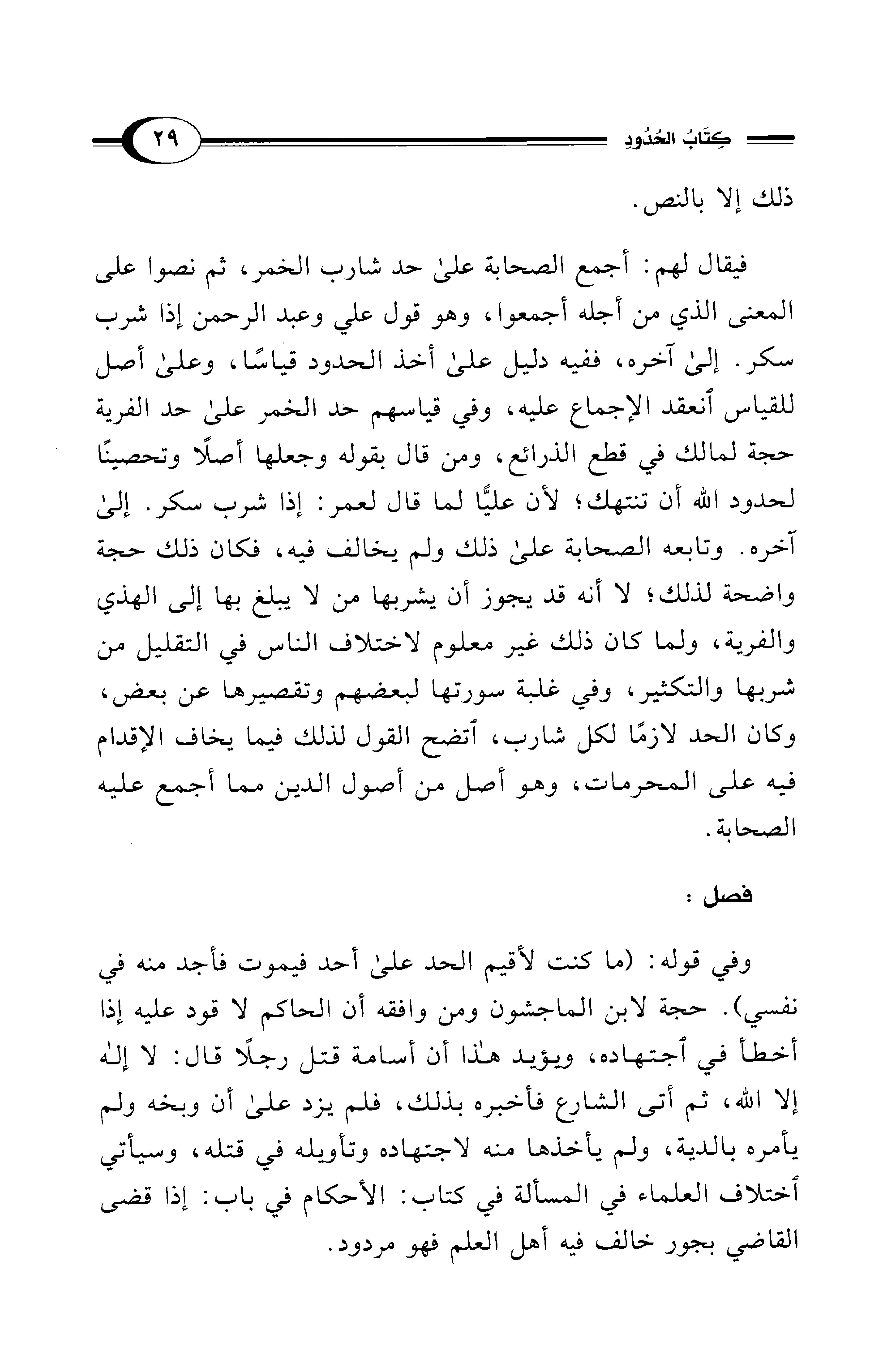 فيقال لهم: أجمع الصحابة على حد شارب الخمر، ثم نصوا على المعنى الذي من أجله أجمعوا، وهو قول علي وعبد الرحمن إذا شرب سكر. إلى آخره، ففيه دليل على أخذ الحدود قياسًا، وعلى أصل للقياس انعقد الإجماع عليه، وفي قياسهم حد الخمر على حد الفرية حجة لمالك في قطع الذرائع، ومن قال بقوله وجعلها أصلاً وتحصينًا لحدود الله أن تنتهك؛ لأن عليًّا لما قال لعمر: إذا شرب سكر. إلى اخره. وتابعه الصحابة على ذلك ولم يخالف فيه، فكان ذلك حجة واضحة لذلك؛ لا أنه قد يجوز أن يشربها من لا يبلغ بها إلى الهذي والفرية، ولما كان ذلك غير معلوم لاختلاف الناس في التقليل من شربها والتكثير، وفي غلبة سورتها لبعضهم وتقصيرها عن بعض، وكان الحد لازمًا لكل شارب، اتضح القول لذلك فيما يخاف الإقدام فيه على المحرمات، وهو أصل من أصول الدين بما أجمع عليه الصحابة.