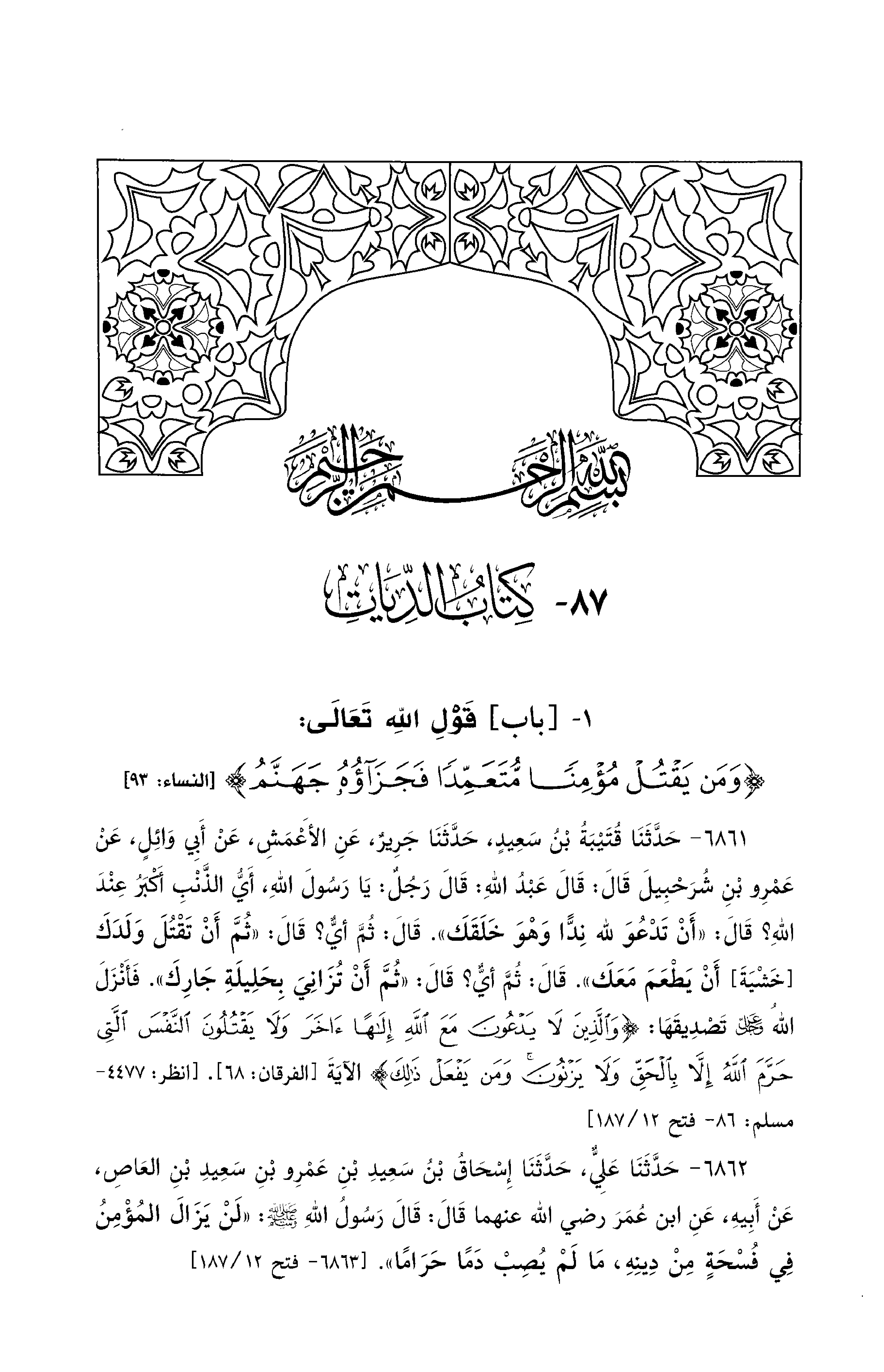1 - [باب] قَوْلِ الله تَعَالَى: {وَمَنْ يَقْتُلْ مُؤْمِنًا مُتَعَمِّدًا فَجَزَاؤُهُ جَهَنَّمُ} [النساء: 93]