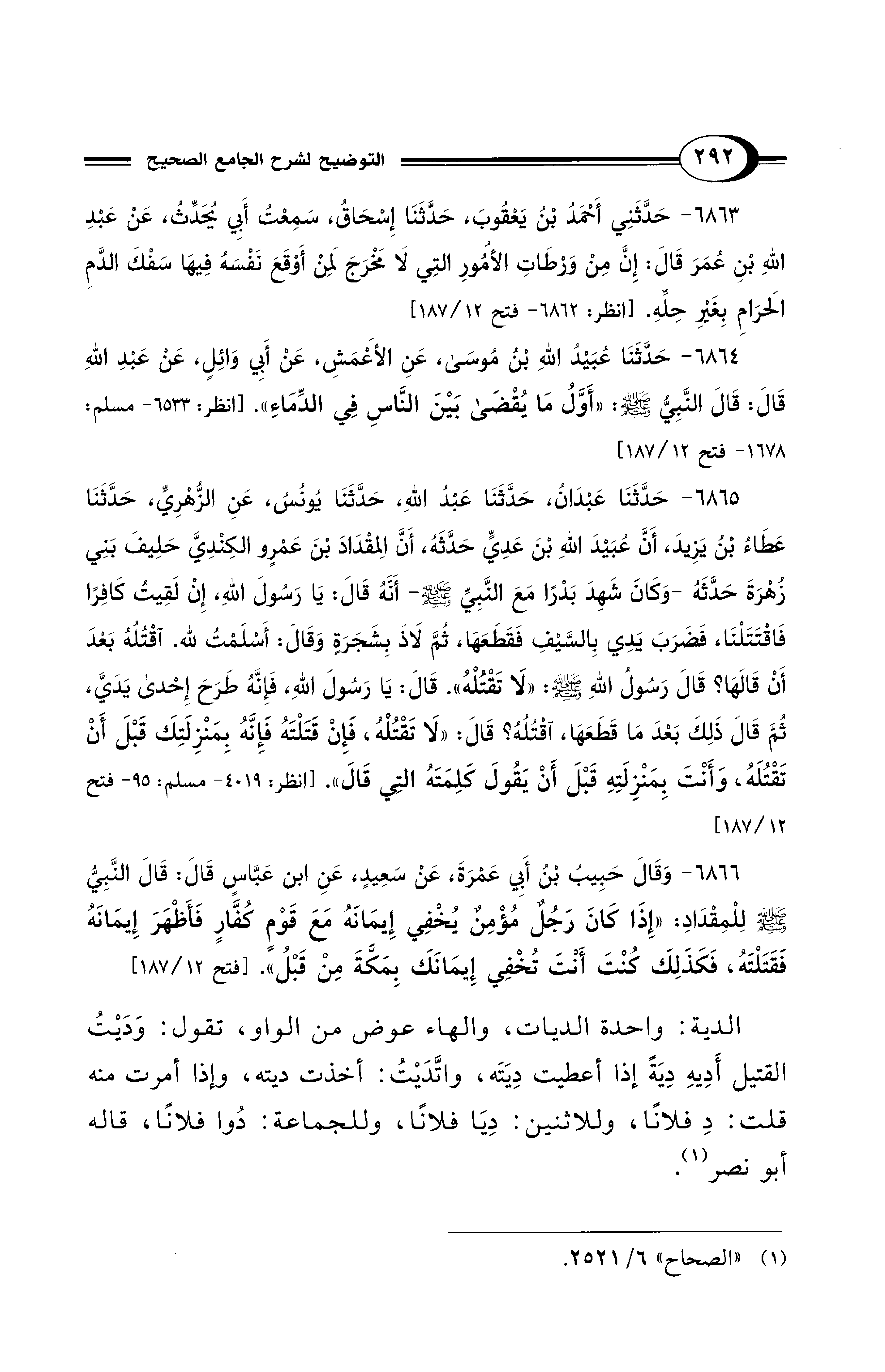 6863 - حَدَّثَنِي أَحْمَدُ بْنُ يَعْقُوب، حَدَّثَنَا إِسْحَاقُ، سَمِعْتُ أَبِي يُحَدِّثُ، عَنْ عَبْدِ اللهِ بْنِ عُمَرَ قَالَ: إِنَّ مِنْ وَرْطَاتِ الأُمُورِ الَّتِي لاَ مَخْرَجَ لِمَنْ أَوْقَعَ نَفْسَهُ فِيهَا سَفْكَ الدَّمِ الْحَرَامِ بِغَيْرِ حِلِّهِ. [انظر: 6862 - فتح 12/ 187]