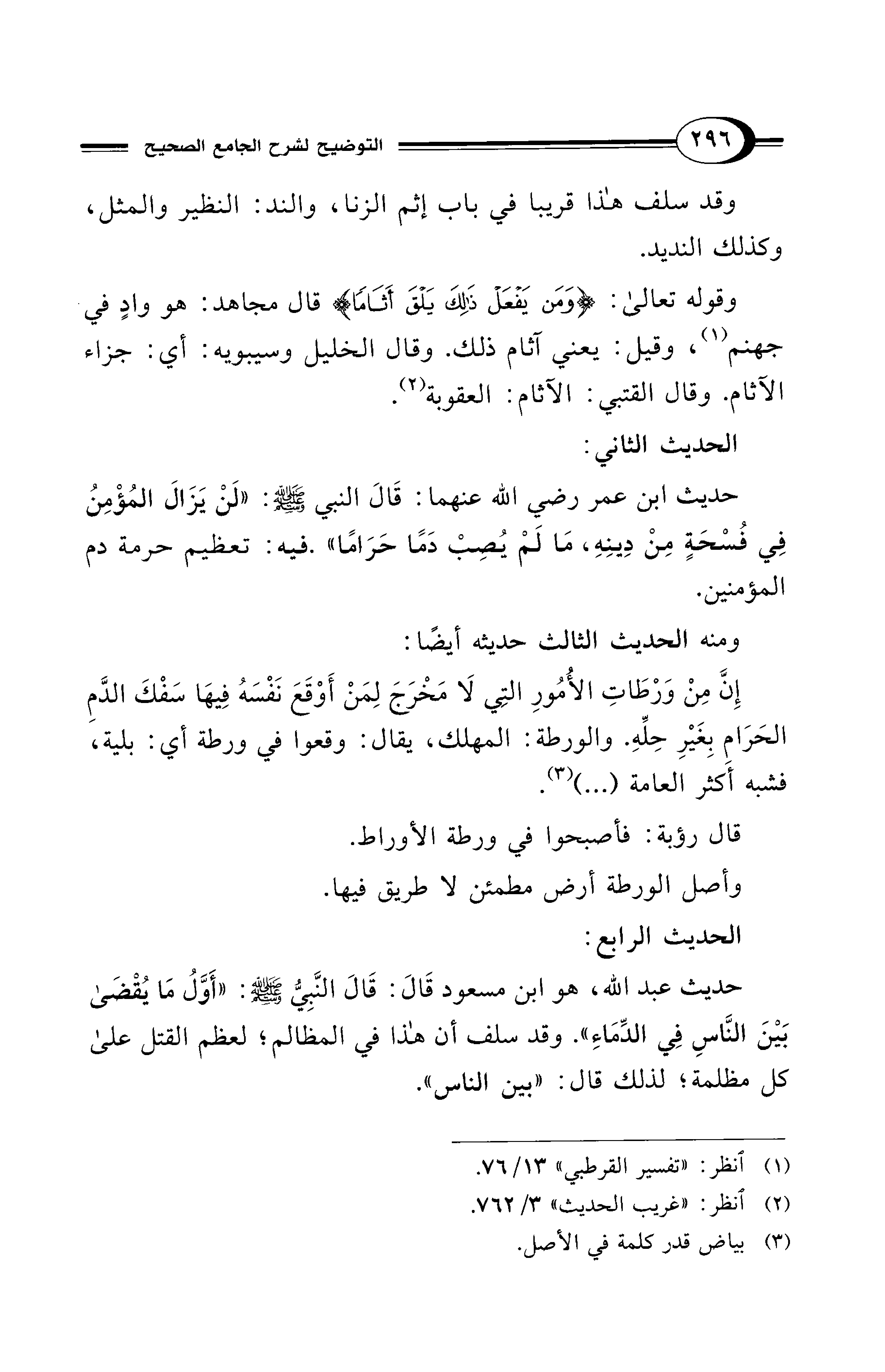 إِنَّ مِنْ وَرْطَاتِ الأُمُورِ التِي لَا مَخْرَجَ لِمَنْ أَوْقَعَ نَفْسَهُ فِيهَا سَفْكَ الدَّمِ الحَرَام بِغَيْرِ حِلِّهِ. والورطة: المهلك، يقال: وقعوا في ورطة أي: بلية، فشبه أَكثر العامة (...) (¬3).