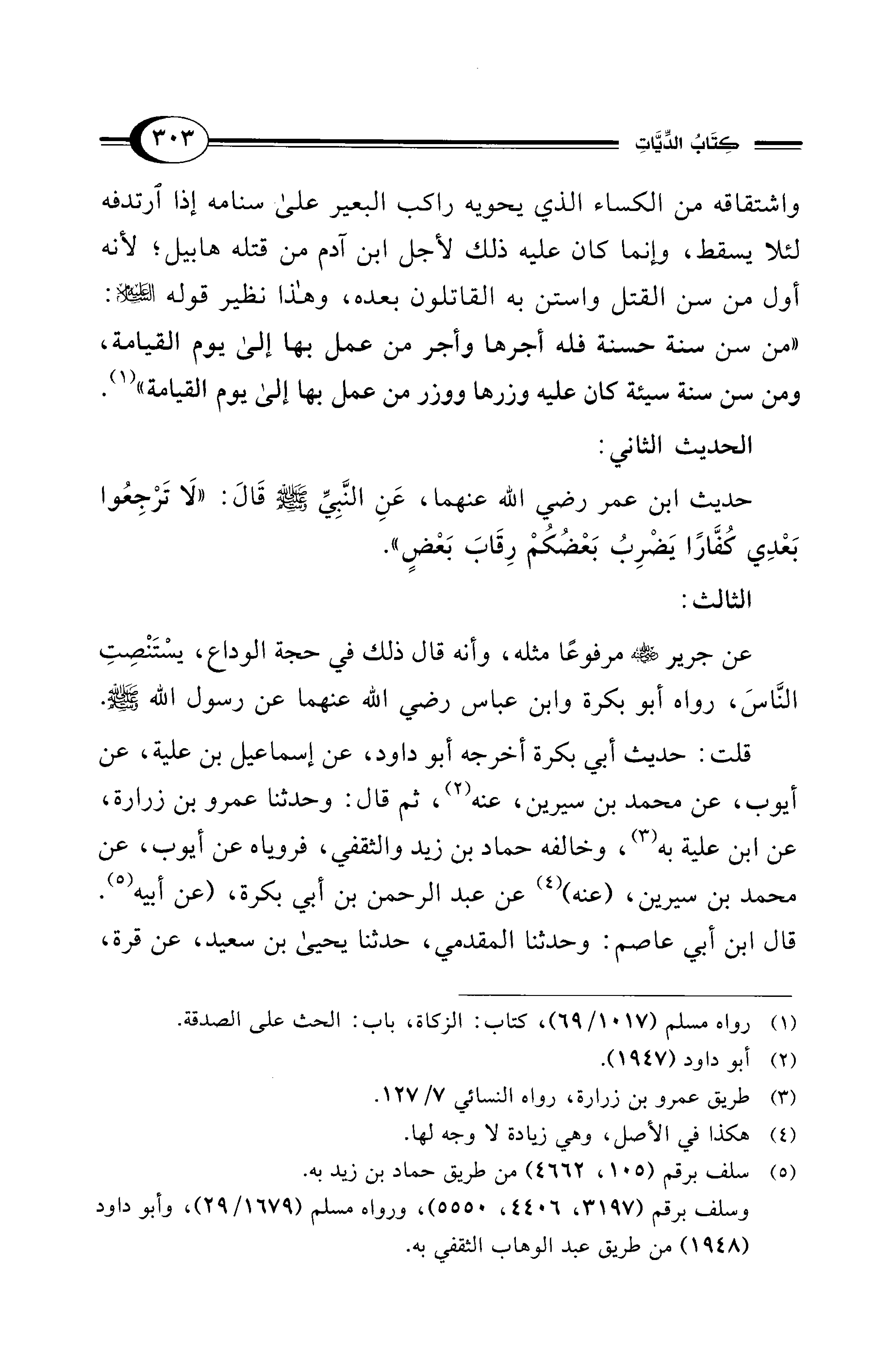 حديث ابن عمر - رضي الله عنهما -، عَنِ النَّبِيِّ - صلى الله عليه وسلم - قَالَ: "لَا تَرْجِعُوا بَعدِي كفَّارًا يَضْرِبُ بَعْضُكُمْ رِقَابَ بَعْضٍ".