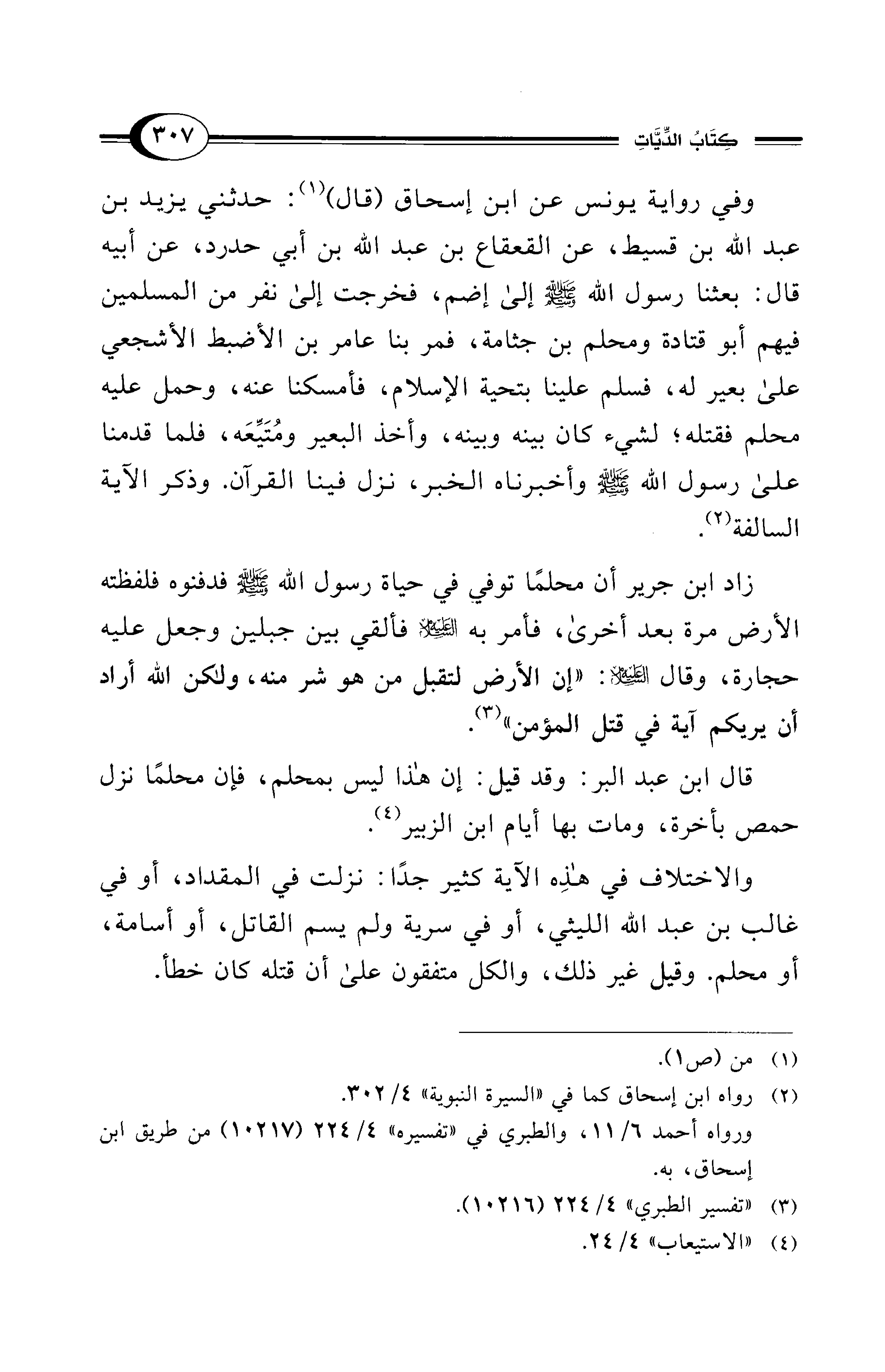 وفي رواية يونس عن ابن إسحاق (قال) (¬1): حدثني يزيد بن عبد الله بن قسيط، عن القعقاع بن عبد الله بن أبي حدرد، عن أبيه قال: بعثنا رسول الله - صلى الله عليه وسلم - إلى إضم، فخرجت إلى نفر من المسلمين فيهم أبو قتادة ومحلم بن جثامة، فمر بنا عامر بن الأضبط الأشجعي على بعير له، فسلم علينا بتحية الإسلام، فأمسكنا عنه، وحمل عليه محلم فقتله؛ لشيء كان بينه وبينه، وأخذ البعير ومُتَيِّعَه، فلما قدمنا على رسول الله - صلى الله عليه وسلم - وأخبرناه الخبر، نزل فينا القرآن. وذكر الآية السالفة (¬2).